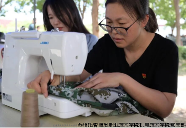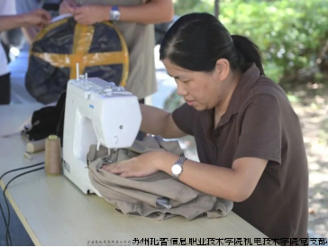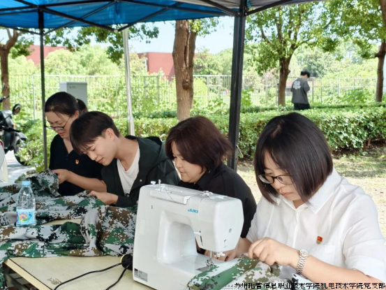 员教师们早早做好准备,两台缝纫机调试妥当,针线、剪刀等工具也一应俱全。党员教师们围在服务点旁,耐心地等待着有需要的同学。当新生们拿着破损的军训服前来时,党员教师们便接过衣物,仔细查看破损情况,然后熟练地穿针引线,或是用缝纫机快速而精准地缝合。