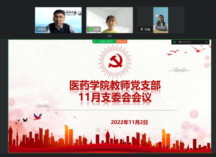 11月2日下午,医药学院教师党支部通过钉钉线上平台召开支委会会议。会议由党支部书记刘雪坤主持,支委委员孙惠、郭鑫参加会议。