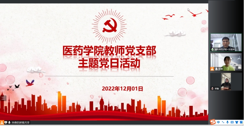 12月1日上午,医药学院教师党支部通过腾讯线上平台召开支委会会议。会议由党支部书记刘雪坤主持,支委委员孙惠、郭鑫参加会议。