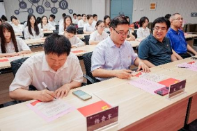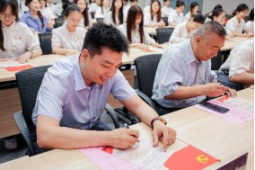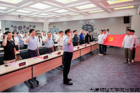 统计学院党委书记王健带领全体党员面向鲜红党旗,重温入党誓词,铿锵有力的誓言字字句句彰显着党员们坚定不移的理想信念。带着这份对党的忠诚,全体党员共同写下政治生日卡,共同回溯入党初心,铭记使命担当。