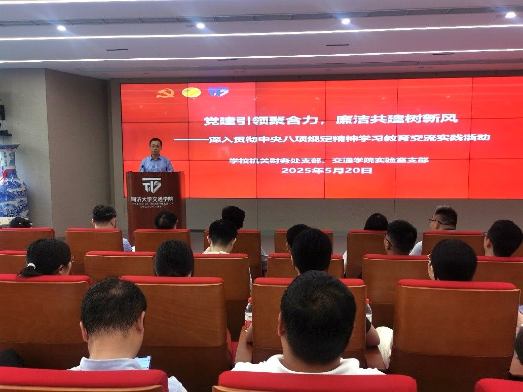 为深入贯彻中央八项规定精神学习教育,强化党风廉政建设,促进党建与业务工作深度融合,2025年5月20日,同济大学交通学院教工第六支部(实验室)与学校机关第十九支部(财务处)联合开展“党建引领聚合力,廉洁共建树新风”主题学习教育交流实践活动。双方党员、业务骨干齐聚一堂,通过实地参观、经验交流、案例剖析与业务研讨,共筑廉洁防线,凝聚发展合力。会议由交通学院党委书记马万经主持,学校机关第十九支部书记韩振、交通学院教工第六支部书记洪玲、双方党员与群众代表共60余人参与活动。