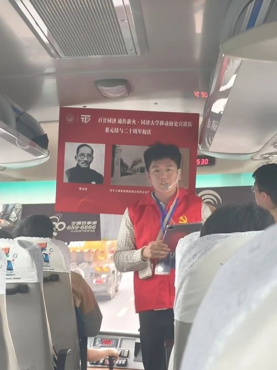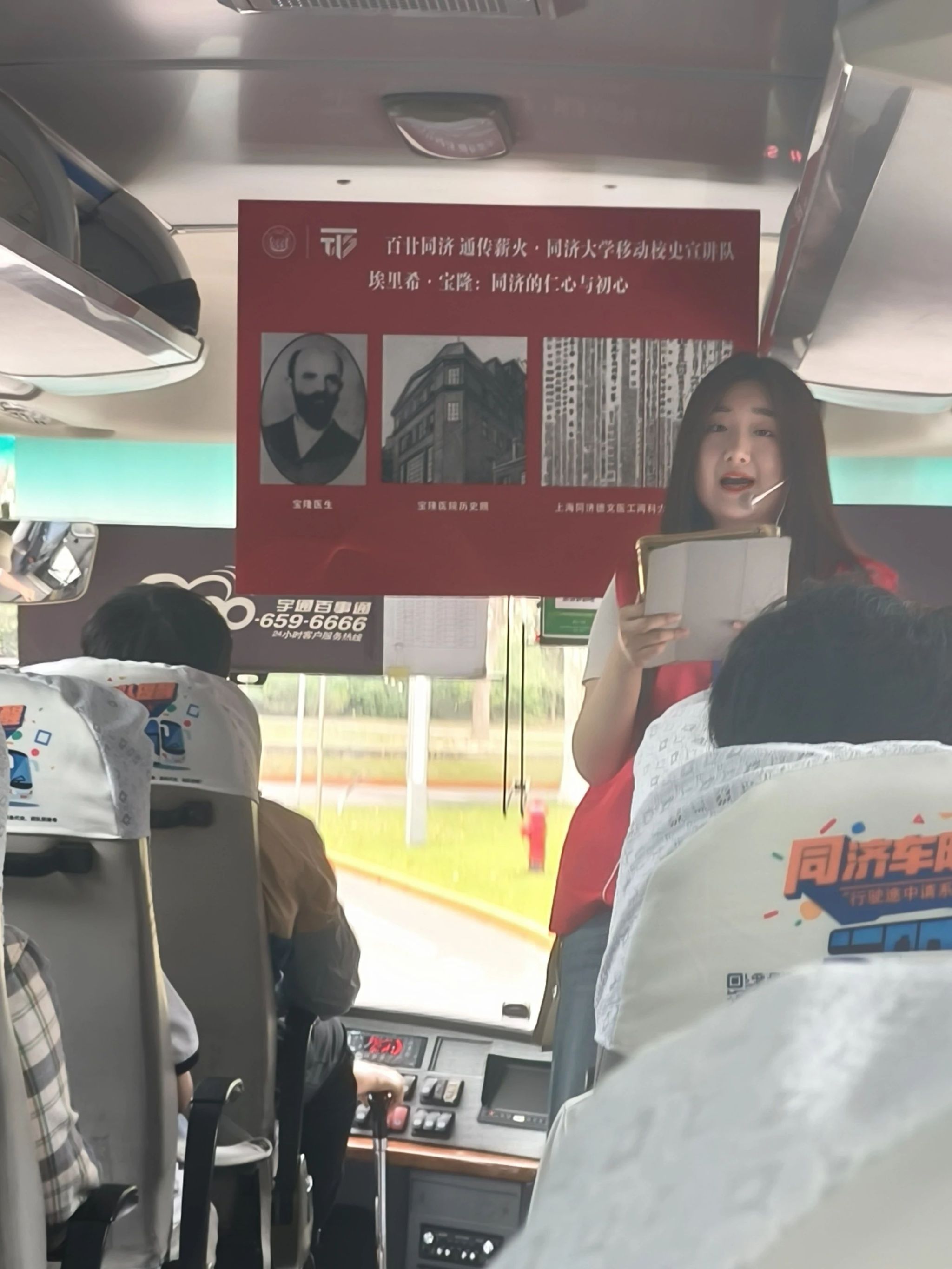 在约30分钟的旅途中,宣讲队员为同学们带来了两个校史小故事,分别是《埃里希·宝隆:同济的仁心与初心》和《蔡元培与二十周年校庆》。第一个故事让同学们了解到同济大学的创始人埃里希·宝隆医生虽来自异国,却将毕生奉献给了中国的医学教育事业。他用自己的生命诠释了“医者仁心”的真谛,也为同济大学注入了“与祖国同行,以科教济世”的精神基因。第二个故事让我们了解到二十周年校庆并未如期举行背后的故事,在那个动荡的年代,同济人并没有被困难吓倒。他们坚守教育阵地,在简陋的教室里认真听讲、积极讨论,在实验室里刻苦钻研、探索科学的奥秘。正是这种坚韧不拔的精神,让同济大学在战争的硝烟中依然能够茁壮成长。