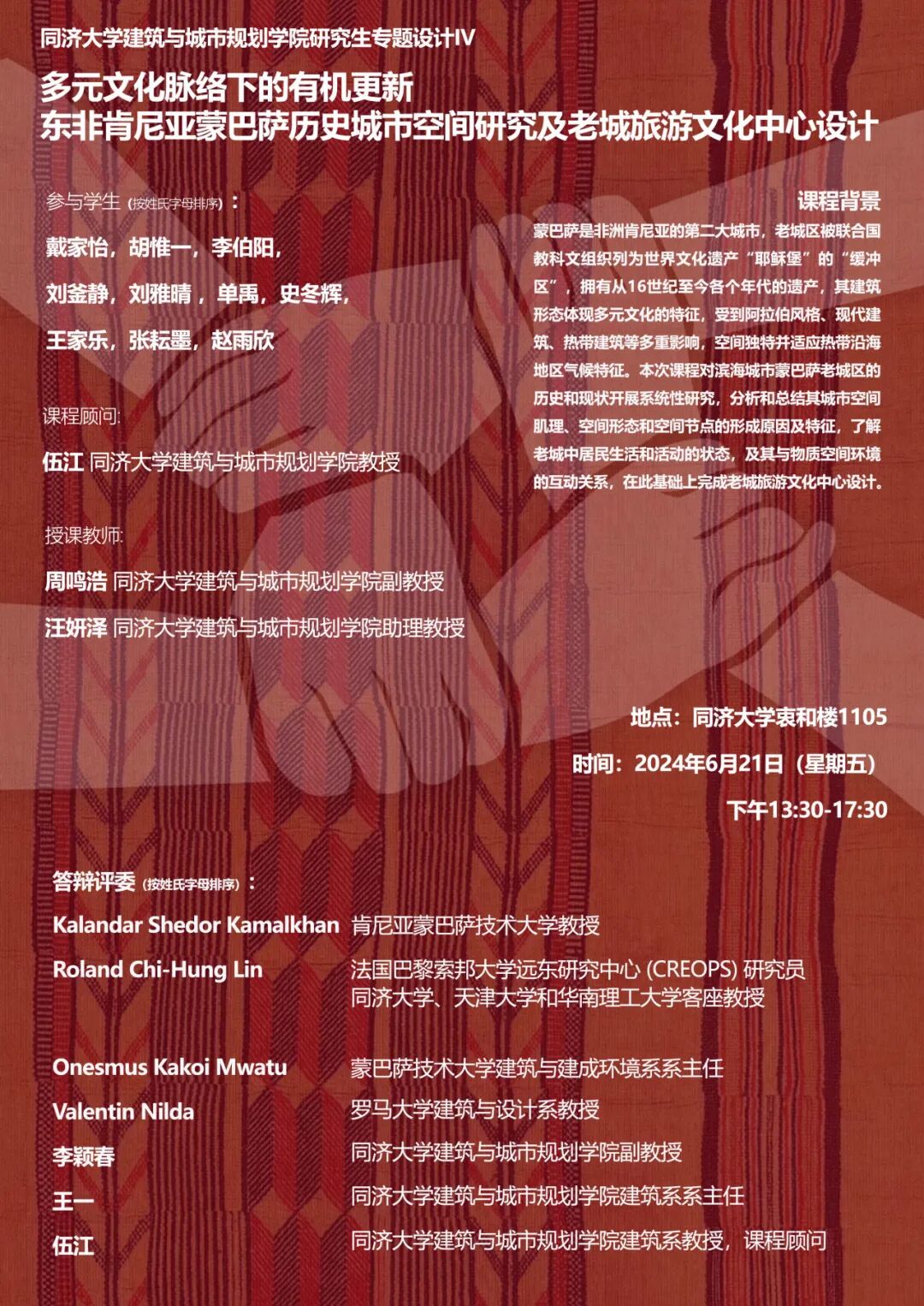 蒙巴萨是非洲肯尼亚的第二大城市,老城区被联合国教科文组织列为世界文化遗产“耶稣堡”的“缓冲区”,拥有从16世纪至今各个年代的遗产,其建筑形态体现多元文化的特征,受到阿拉伯风格、现代建筑、热带建筑等多重影响,空间独特并适应热带沿海地区气候特征。本次课程对滨海城市蒙巴萨老城区的历史和现状开展系统性研究,分析和总结其城市空间肌理、空间形态和空间节点的形成原因及特征,了解老城中居民生活和活动的状态,及其与物质空间环境的互动关系,在此基础上完成老城旅游文化中心设计。