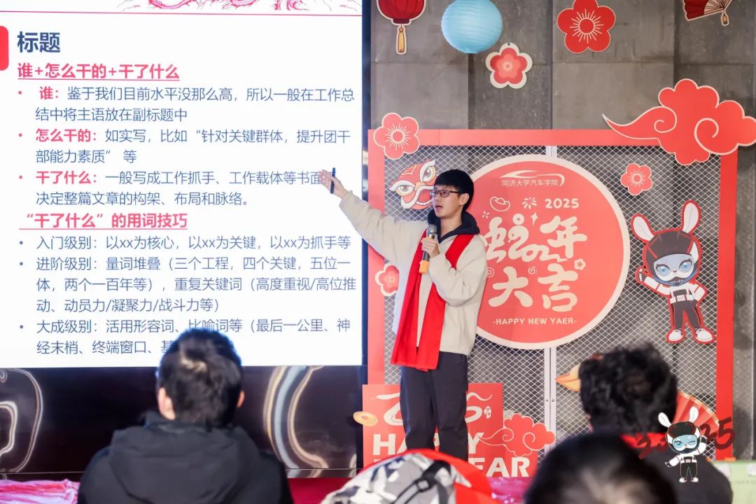 汽车学院团委宣传部部长李承翰分享新媒体运营编辑相关技巧,他结合自身学生工作经历,从任务分工、图文审美、内容规范等角度进行讲解。