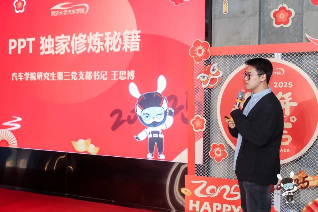 汽车学院研究生第三党支部书记王思博分享了PPT制作经验,他结合自身各类ppt制作经历,从基础操作、设计美化、资源搜集等角度展开讲解。