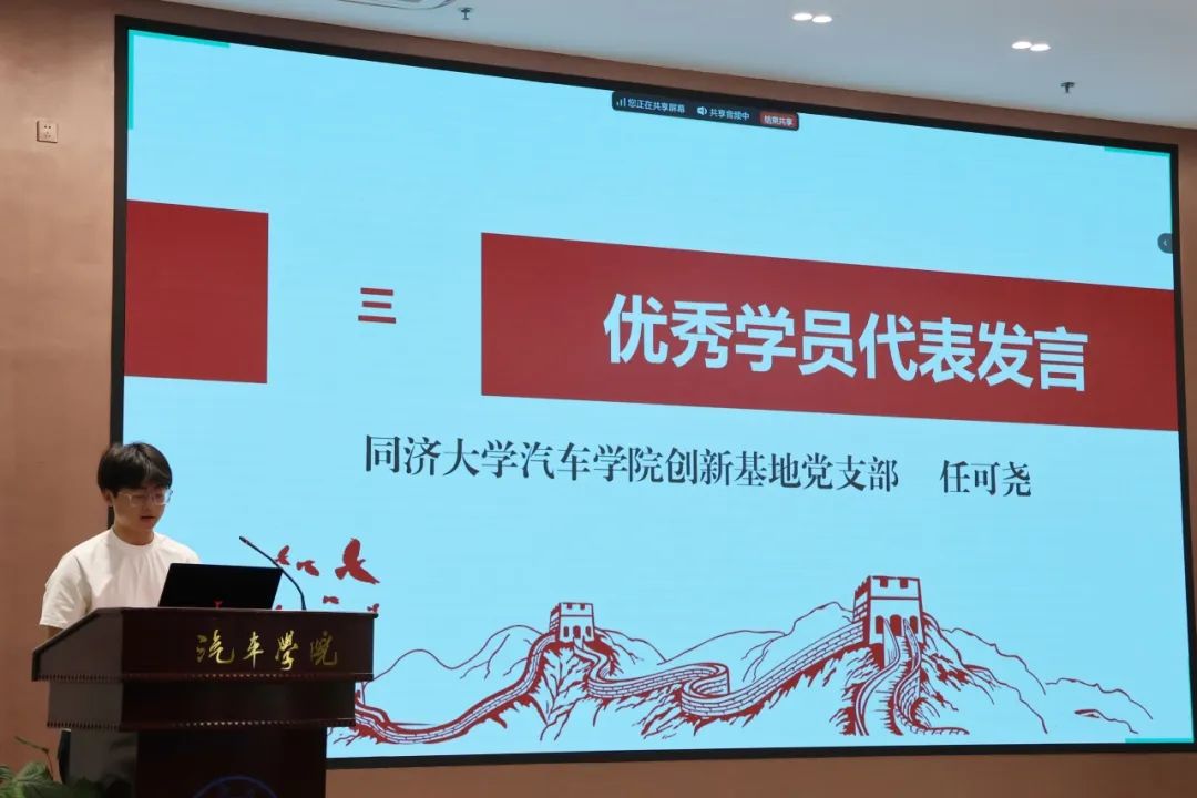 同济大学汽车学院科技创新基地党支部预备党员任可尧作为2024年秋季发展对象培训班的优秀学员代表进行发言。他从自身经历出发,分享了在壳牌汽车环保马拉松大赛中带领团队克服氢燃料电池系统故障、最终顺利完赛的经历。他表示,成为预备党员是新的起点,今后将以“知行合一”为准则,勇担时代使命,在科研、实践和日常生活中持续发挥先锋模范作用。他号召同学们以更加饱满的热情和更加坚定的信念,投身到实现中华民族伟大复兴的事业中去,书写属于新时代的青春华章!