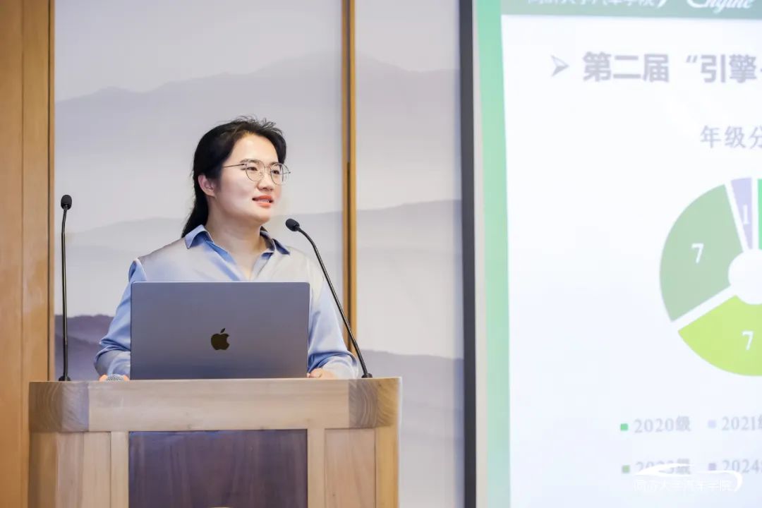 葛畅系统总结了第二届"引擎+"校友学生结对计划的成效,并介绍第三届结对计划的具体方案。上一届计划累计组织交流活动50余场,形成行业调研报告8份,开展寒暑期社会实践4项,获得专项实习内推岗位9个,通过8期校友沙龙搭建起覆盖84位校友、辐射300余名学生的成长网络。葛畅向持续支持学院发展的校友致谢,并特别强调了“加法效应”,期待未来一年通过企业参访、校友专访、联合课题、实践实习等多种形式,增强校友间以及校友与学生间的联系,借此链接更多校友和学生,通过资源叠加实现优势互补,借助平台扩容促进价值共生,在双向赋能中培育更多人才。