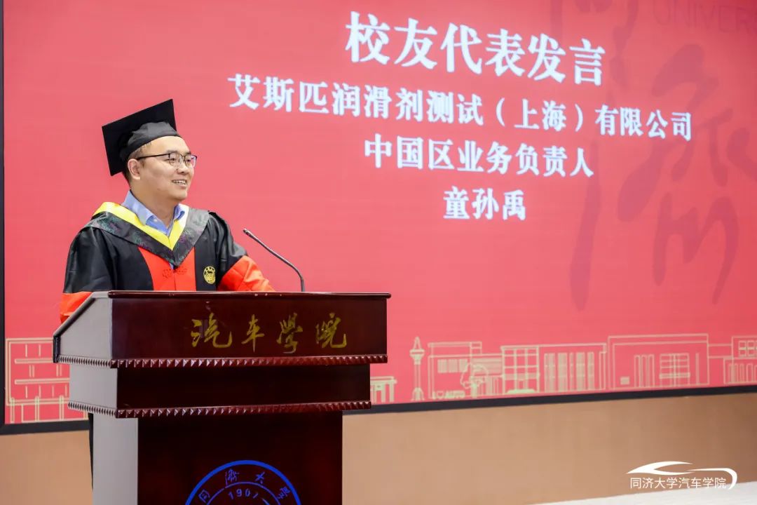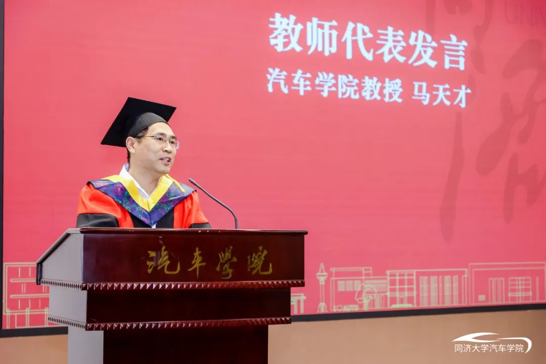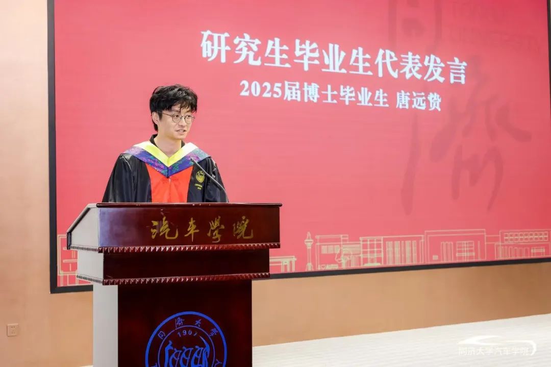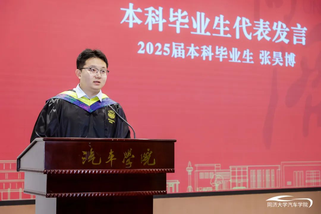 童孙禹作为校友代表发言。他分享了自己在同济大学难忘的校园生活,寄语毕业生要学会独立思考与判断,创新性地解决问题,将个人的职业发展与推送民族汽车工业进步的重任紧密连结,做独立破浪的工程师,也做彼此并肩前行的追梦人。