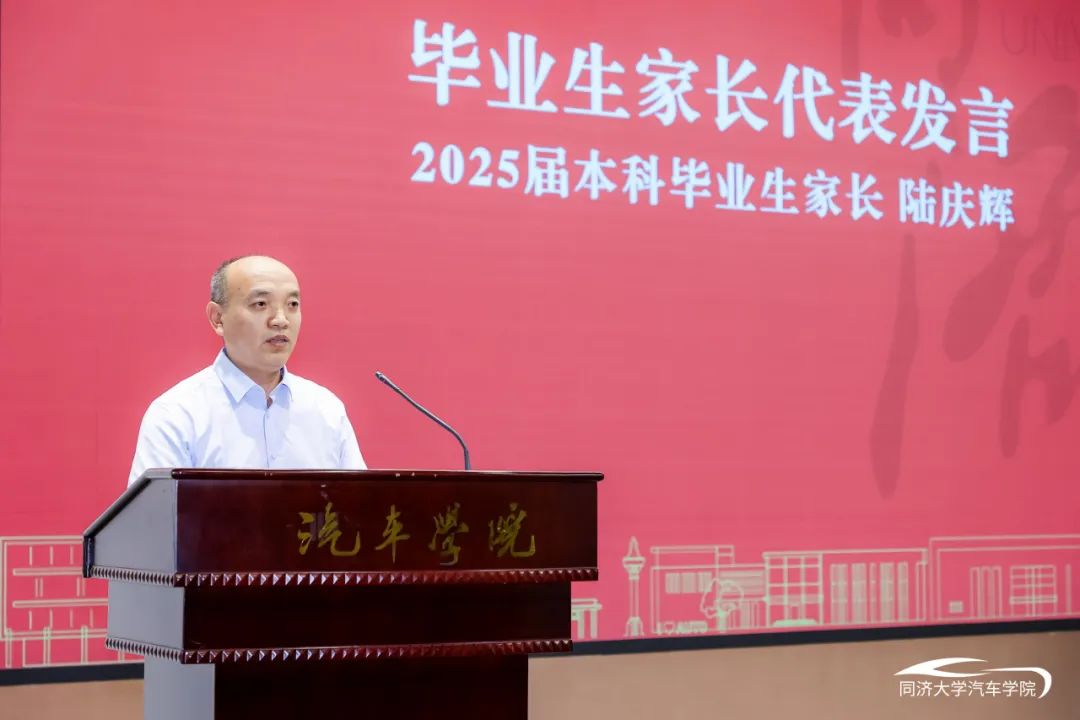 2025届本科毕业生家长陆庆辉作为家长代表发言。他向学院教师表达感谢,赞扬了学院在教书育人方面的深厚学术底蕴和前沿教学理念,很欣慰自己的孩子在学院培养下茁壮成长。最后,他祝福毕业生们勇敢地走向未来。