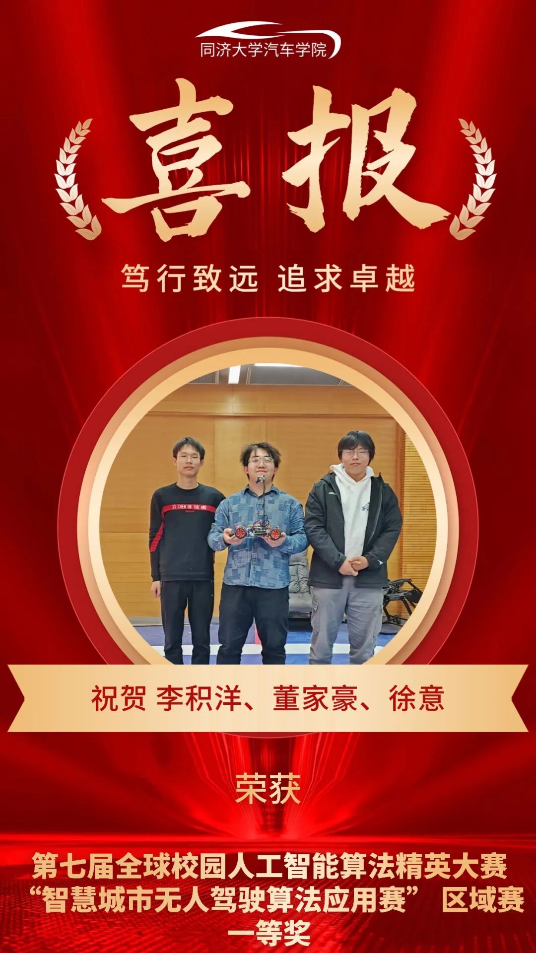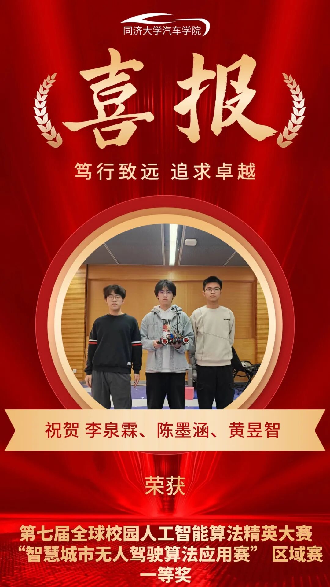11月10日,第七届全球校园人工智能算法精英大赛 “智慧城市无人驾驶算法应用赛” 区域赛顺利举行。同济大学TU-Smart智能车队的三支参赛队伍凭借出色表现,全员荣获省赛一等奖,并成功晋级全国总决赛。