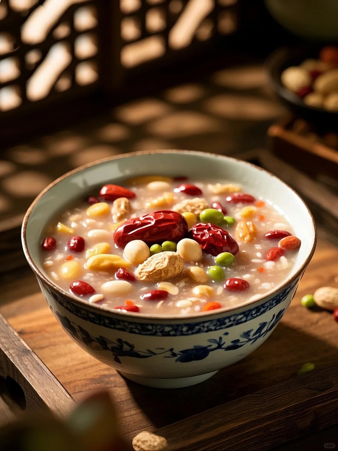 小寒与腊八节日期接近,所以,喝腊八粥也成为了小寒节气的特有风俗,尤其是北方地区。腊八粥食材丰富,包括大米、小米、糯米等谷类,黄豆、红豆、绿豆等豆类,还包括红枣、花生、莲子等干果,富含维生素、矿物质、膳食纤维等,既美味又营养,是"食物多样、谷类为主、粗细搭配"膳食模式的典范。