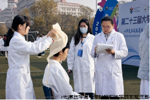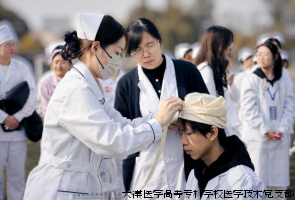 本届技能节充分发挥学校作为全国急救教育省级协作组组长单位资源优势,将心肺复苏技术、头部包扎项目作为学生技能节赛事的核心内容,以“线上系统培训+线下重点训练+现场技能竞赛”的模式扎实推进,在前期对5100余名在校学生培训的基础上,选拔约280名优秀学生进入线下综合培训与决赛环节。