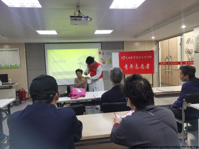为服务健康天津建设,提高老年人自我保健的意识及能力,传播健康理念,4月18日上午,天津医学高等专科学校医学技术党支部组织师生走进景兴西里社区为社区老人开展“科学饮食 共筑健康”为主题的春季养生宣教活动。