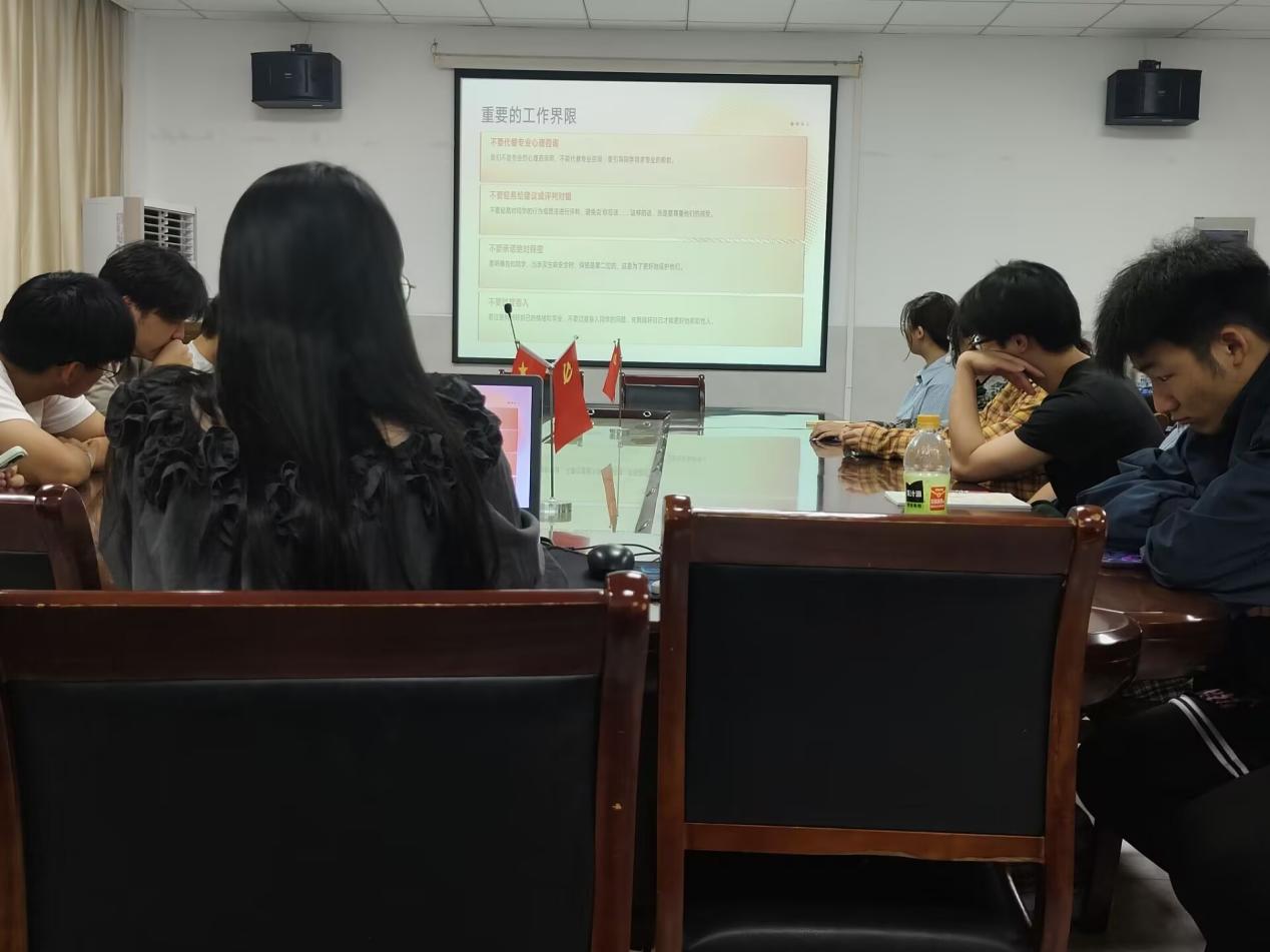 培训中,邓敏以作为“观察员”关注班级心理动态、作为“支持者”提供安全倾诉空间、作为“宣传员”普及心理健康知识等“三重角色”具象化心理委员职责,阐明了心理委员积极关注、倾听陪伴、信息传递和及时报告等四大职责,并重点讲解了“保密例外原则”,强调遇到涉及生命安全事情时,须第一时间上报。培训中还列出了“四不做”红线,避免心理委员履职越位或缺位。同时,梳理了辅导员、学院心理辅导站以及学校心理健康中心等“支持系统”,公布了咨询渠道,还特别提醒心理委员们做好自我关怀,避免情绪耗竭。