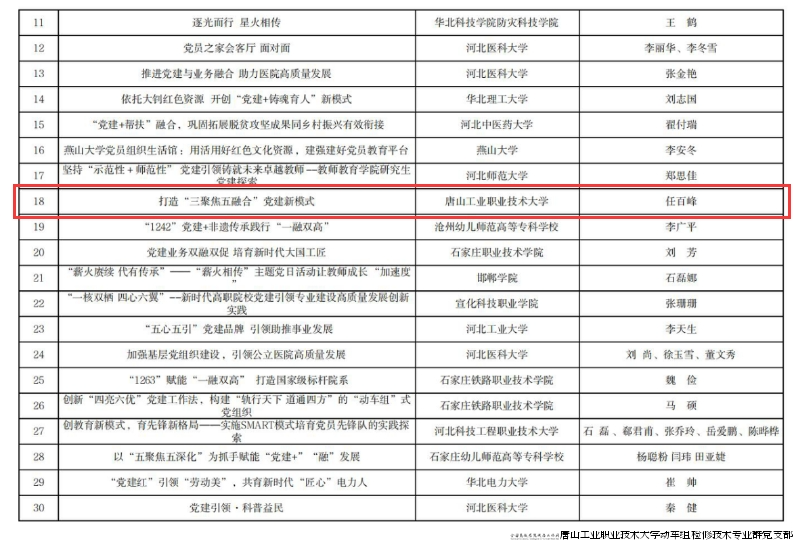 近日,中共河北省委教育工委下发了《关于公布2024年河北省高校党建主题作品评选结果的通知》,唐山工业职业技术大学动车组检修技术专业群党支部党建主题作品:案例《打造“三聚焦五融合”党建新模式》荣获二等奖,是党支部入选全国高校“双带头人”教师党支部书记“强国行”专项行动团队以来的又一重要成果。