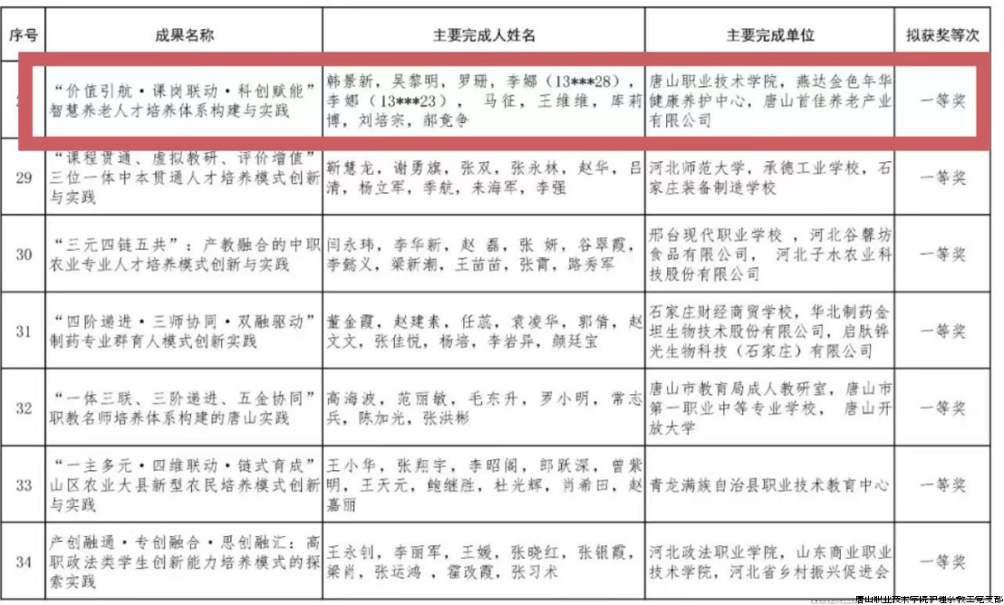 近日,依据省委省政府功勋荣誉表彰工作领导小组办公室批复,经省政府批准,由省教育厅承办的2025年河北省教学成果奖评比表彰活动落下帷幕。唐山职业技术学院韩景新团队研发的《“价值引航・课岗联动・科创赋能”智慧养老人才培养体系构建与实践》凭借创新性、实用性与实效性,成功斩获一等奖。作为全国党建工作样板支部培育建设单位,护理系教工党支部全程参与成果研发与实践,党员教师在过程中积极发挥先锋模范作用,此次获奖既是团队教学实力的彰显,更是支部“党建+教学创新”融合成效的生动体现。
