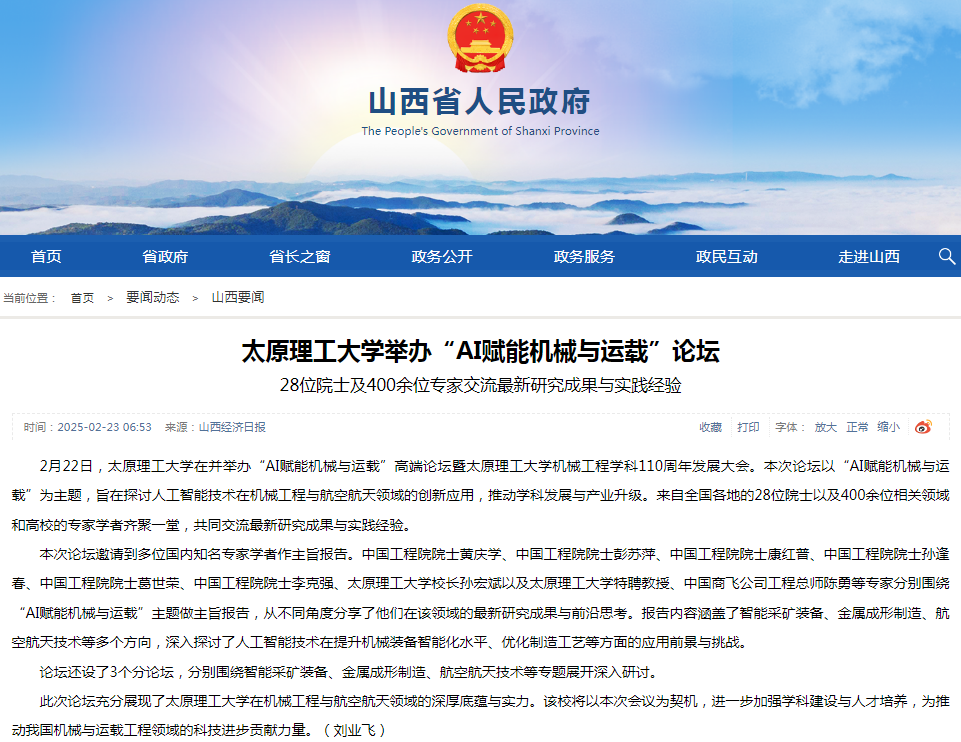 2月22日,太原理工大学在并举办“AI赋能机械与运载”高端论坛暨太原理工大学机械工程学科110周年发展大会。本次论坛以“AI赋能机械与运载”为主题,旨在探讨人工智能技术在机械工程与航空航天领域的创新应用,推动学科发展与产业升级。来自全国各地的28位院士以及400余位相关领域和高校的专家学者齐聚一堂,共同交流最新研究成果与实践经验。