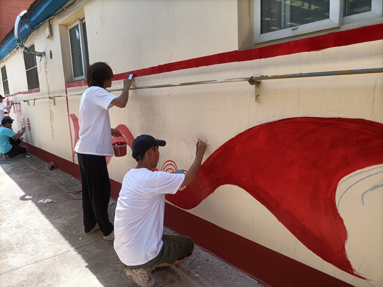 在现场,同学们分工合作,默契配合,精心设计。从最初对规定墙面的测量,到对墙绘内容的设计构想、方案图稿的确定,再到正式上墙绘制、勾线铺色和最终细化完成,历经了7天的时间。绘制过程中,同学们认真勾线,仔细对大面积的色块进行填充,一笔一划对小面积内容对象调整修形,对图案纹理进行完善,最后再精心实现颜色效果的自然过渡、立体效果的添加。炎炎夏日下,同学们不辞辛苦,力图将画面物象神态和动态情境进行生动的描绘。大家热情高涨,战高温、斗酷暑,加班加点,充分发挥自己的艺术特长。在默契配合和相互鼓励下,60米长的墙绘终于如期完成。