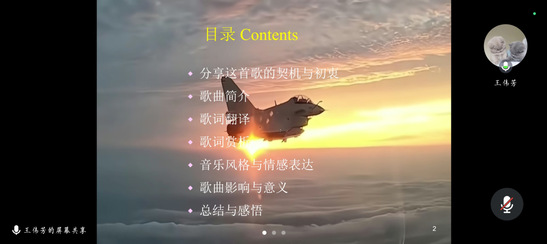 王伟芳老师从七个方面展开讲座:分享歌曲的契机与初衷、歌曲简介、歌词翻译、歌词赏析、音乐风格与情感表达、歌曲影响与意义以及总结与感悟。王老师通过对比歌词的中文直译和改译展开论述。她认为,我们之所以分享此曲是出于地缘政治、军事竞争、科技发展、社会问题等方面的考虑。此曲专为美国海军陆战队创作,最初是美国慈善组织为军队募捐所使用的歌曲,后改编成鼓舞海军陆战队士气的战歌。通过对比歌词的中文直译和中文改译,王老师发现,直译呈美国文化取向,而改译呈中国文化取向。同时,王老师对此曲的词汇运用、句式特点、音乐风格、情感表达等进行了赏析。最后,她总结道:《勇士之歌》以其震撼的歌词和激昂的旋律,塑造了英勇无畏的战士形象,展现了战争的残酷与军人的使命,其独特的音乐魅力与军人精神激荡人心,催人奋进。