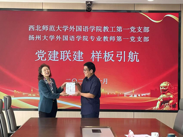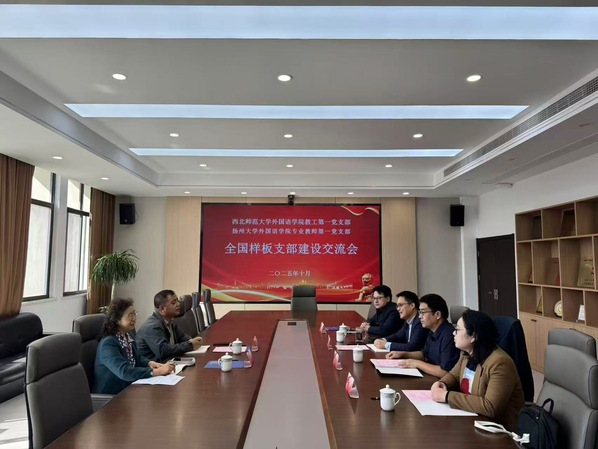 会议伊始,居学明书记从新时代党建、师资队伍提升、教学科研发展、社会服务工作等方面介绍了扬州大学外国语学院所取得的成绩,并希望两个样板支部加强共建联建,促进双方工作再上新台阶。随后,季小民与吕文澎分别介绍了各自支部在全国样板支部建设方面取得的成就与存在的不足,并同与会者就支部开展AI赋能教师行动、主题党日活动、党建课题申报等进行了广泛而深入的交流与研讨,尤其是双方进行了视频交流学习,共同观看了学习强国《习近平总书记用典双语解读》系列微课(西北师大外国语学院党员主创)和英韵唐诗宋词音乐视频(扬州大学外国语学院教师霍红和刘猛主创),并互赠纪念品、合影留念。最后,吕文澎进行了总结发言。