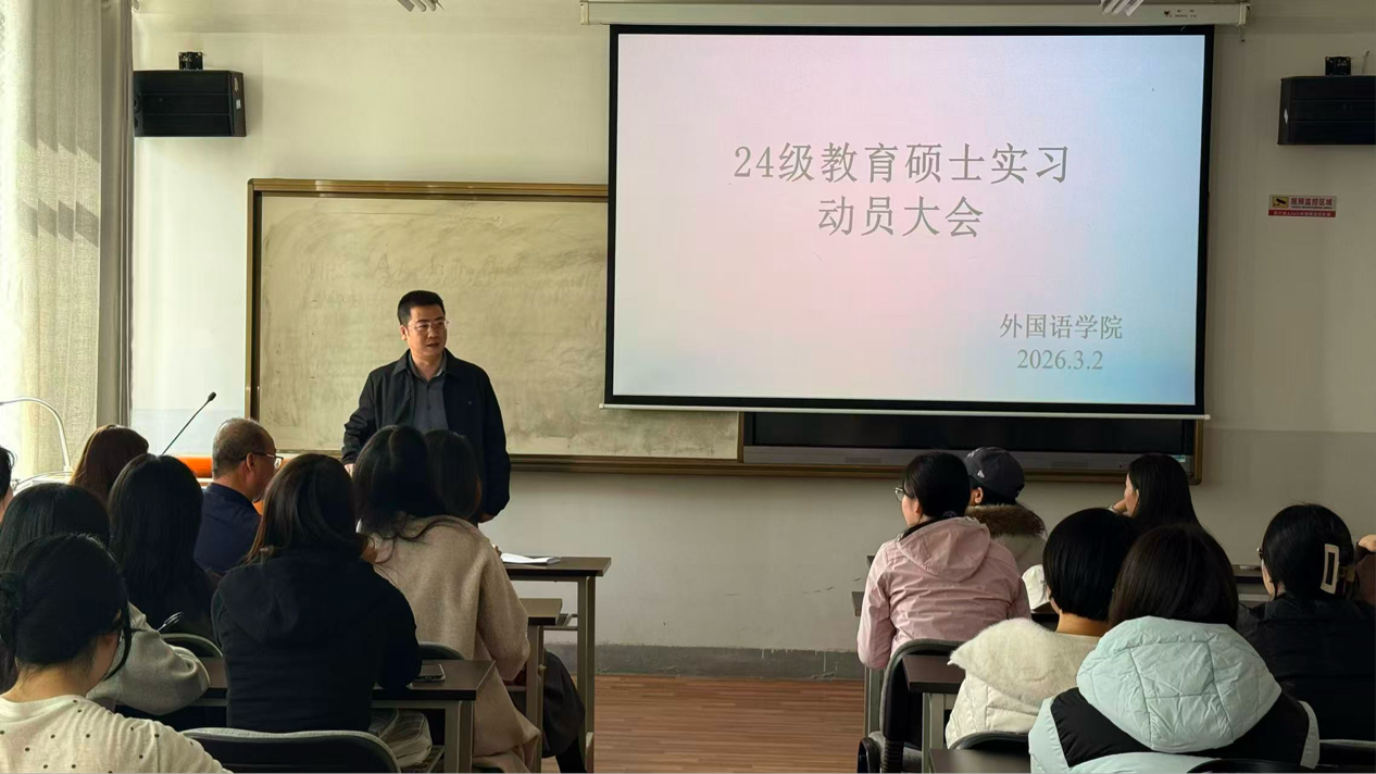 为扎实推进24级教育硕士实习工作,明确实习要求与纪律规范,3月2日下午,外国语学院在学院教室605召开24级教育硕士兰内实习动员大会。杨保林副院长、教育硕士管理中心主任钟莉婷老师、副主任王飞老师出席会议并讲话,2024级57名教育硕士参加会议。