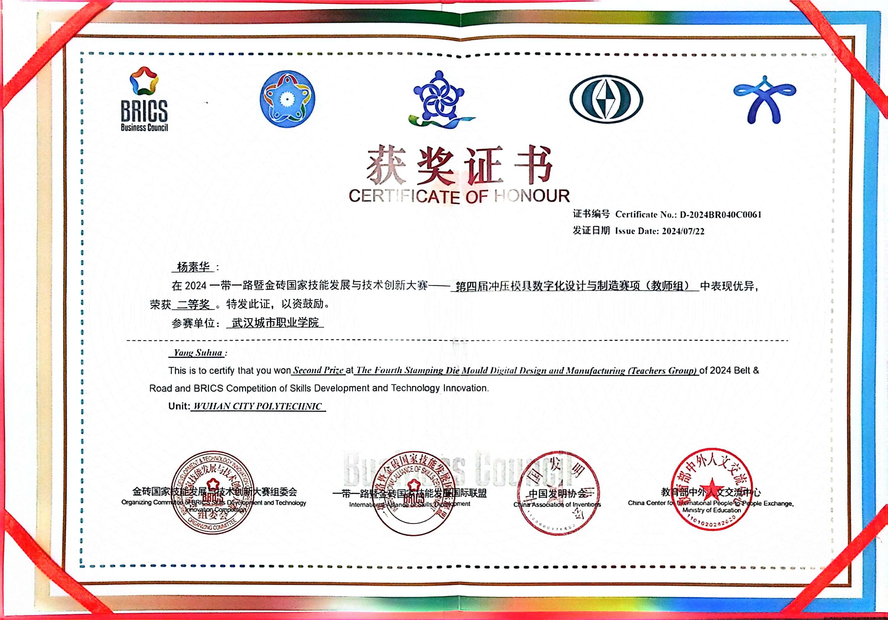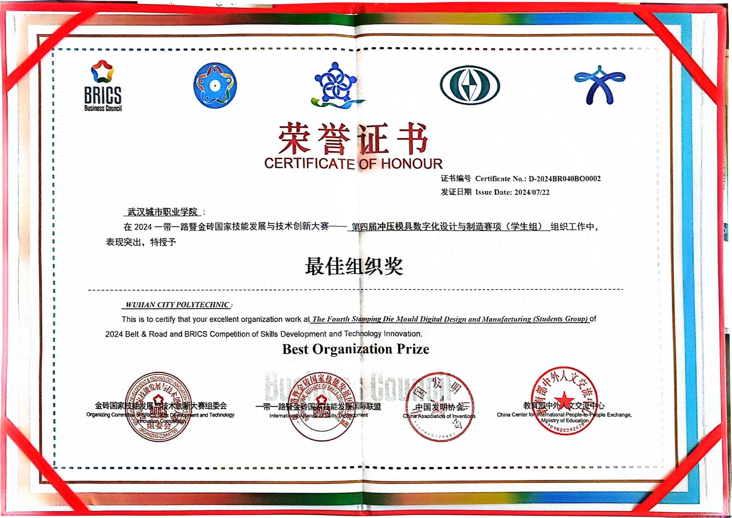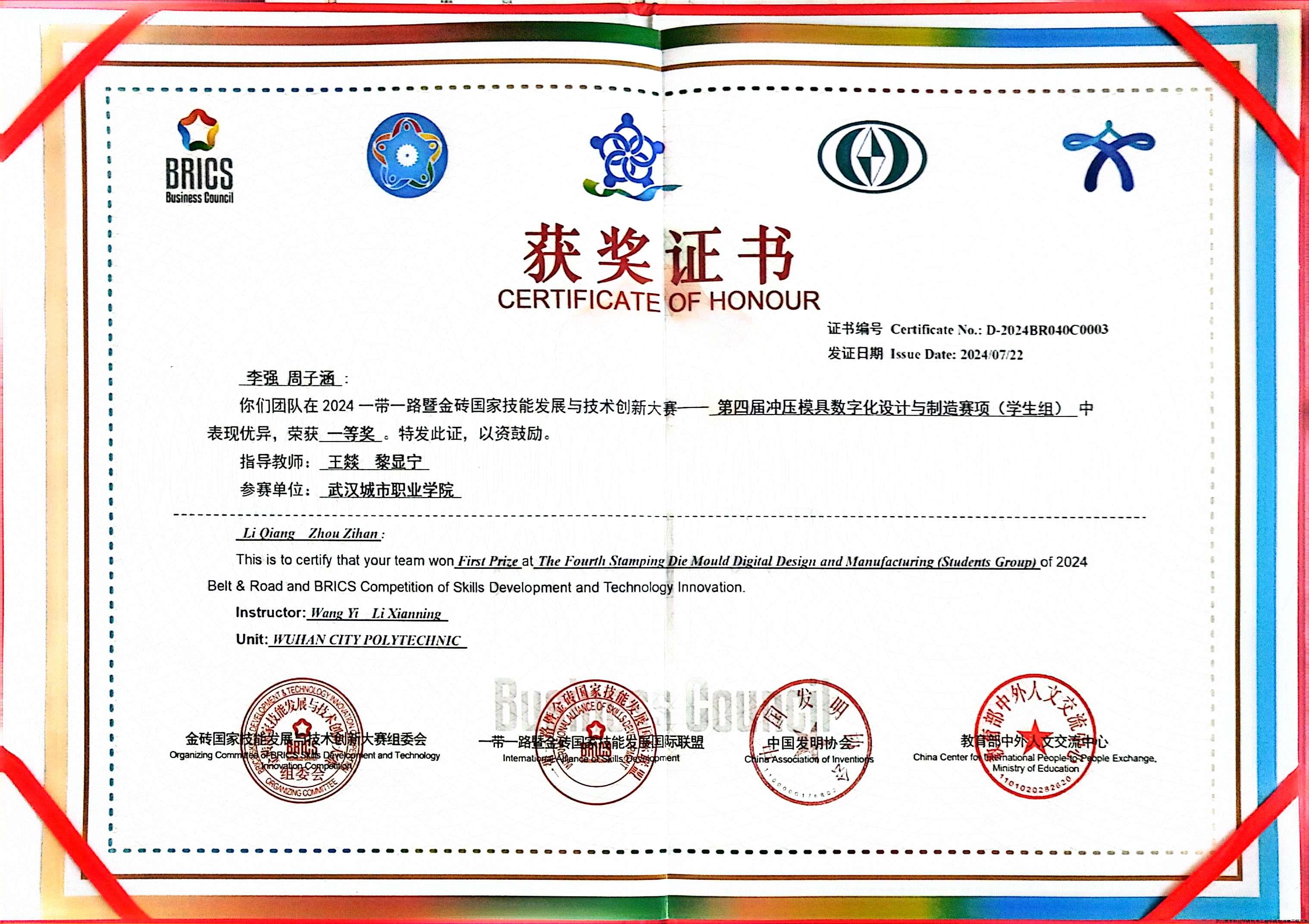 在党建的坚强引领下,武汉城市职业学院教师第二党支部积极响应国家“技能强国”战略号召,充分发挥党组织在教育教学和技能培养中的战斗堡垒作用,7月22日传来振奋人心的消息—教师第二党支部师生团队在2024一带一路暨金砖国家技能发展与技术创新大赛冲压模具数字化设计与制造决赛中脱颖而出,荣获多项大奖,为学校赢得了荣誉,也为我国技能人才培养贡献了重要力量。