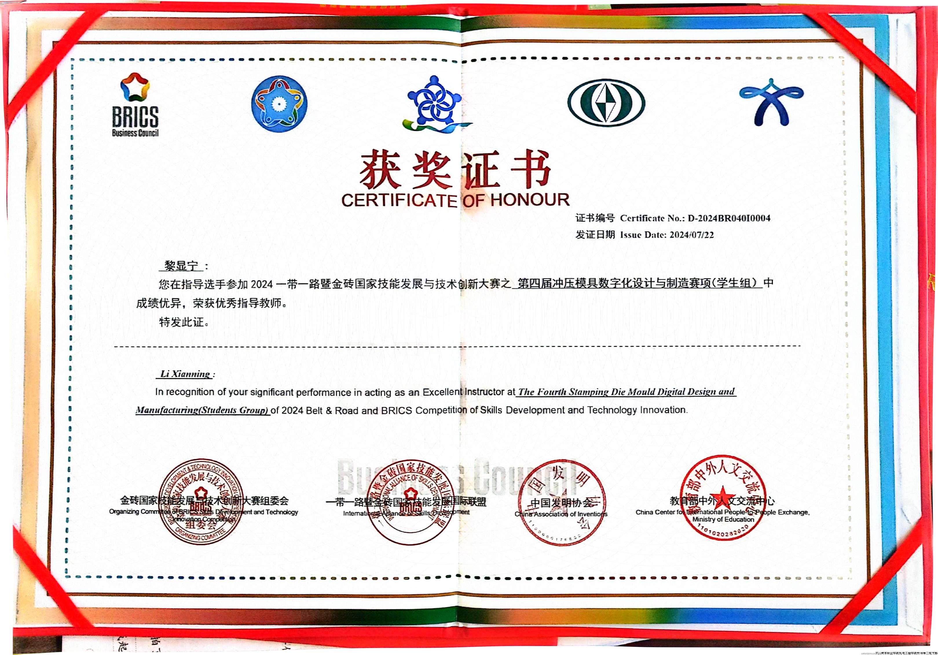 图8 黎显宁优秀指导教师