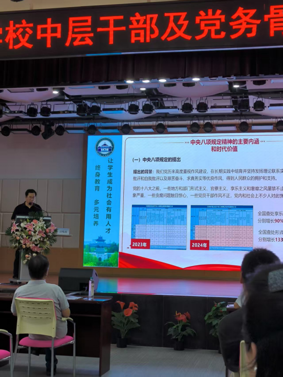 武汉大学纪委办公室汪咏波主任以《锲而不舍落实中央八项规定精神》为题作辅导报告,他深入解读了中央八项规定的核心要义,结合教育系统实际,剖析了作风建设中的常见问题与风险点。通过警示教育案例,汪咏波强调了纪律的刚性约束,详细讲解了构建长效机制、强化监督问责的具体路径,引导学员筑牢廉洁从教的思想根基,营造风清气正的校园生态。