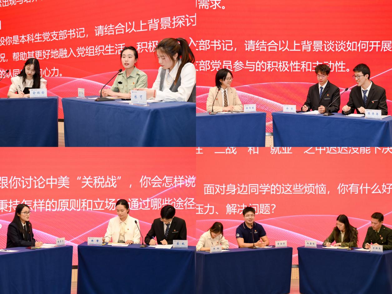 “党员有话说”环节则紧扣时代脉搏,设置多元议题,通过即兴研讨方式展现学生党员的认识问题、解决问题的能力。面对入党积极分子融入党组织困难的问题,俞昳安、唐泽源和林可深入探讨,提出谈心谈话、差异化管理等举措;聚焦如何深入贯彻中央八项规定精神学习教育,徐自牧、徐乐和陈弈舟提出结合廉政知识竞赛、案例分析等形式增强理论学习实效性;针对中美“关税战”这一时政热点,蔡威、张荠月和陈馨从历史进程、政治站位等角度分析,引导同学理性看待国际局势;针对毕业季焦虑问题,杨嘉怡、王盼、万梓良和董浩澎分享倾听陪伴、团队学习等方法,帮助同学缓解压力