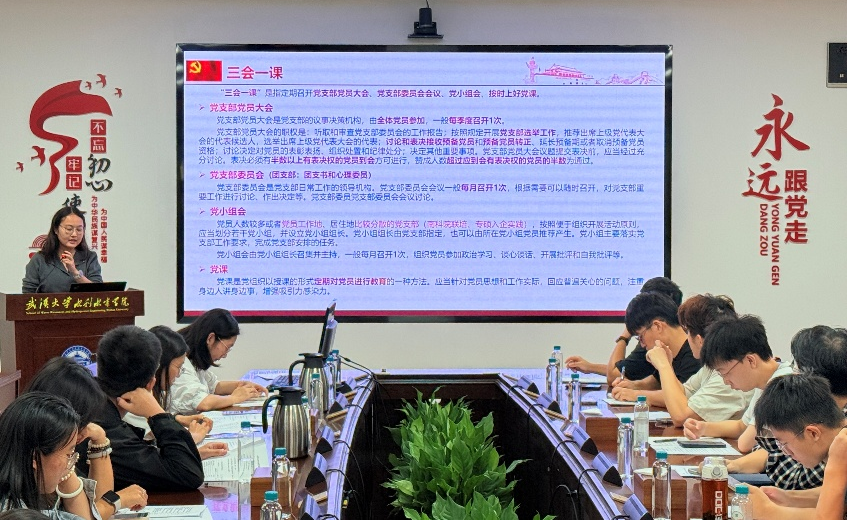 万柳柳就“三会一课”制度进行了介绍。她结合以往党支部特色主题党日活动的成功实践,从联合党建、社会实践和特色创新三个维度,鼓励支部通过丰富多样的组织生活增强凝聚力和活力,把“三会一课”支部落到实处、发挥实效。