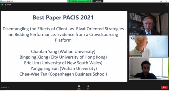 杨超凡获奖论文的题目是Disentangling the Effects of Client- vs. Rival-Oriented Strategies on Bidding Performance: Evidence from a Crowdsourcing Platform(《众包平台的雇主和对手导向的策略研究》,论文链接:https://aisel.aisnet.org/pacis2021/80/ ),论文首次将竞标众包研究中的策略进行整合,提出了众包平台威客的情境化策略。该论文由我院孙永强教授和和哥本哈根商学院陈致玮教授联合指导,合作者还包括香港城市大学的熊冰清博士和新南威尔斯大学的Eric Lim博士等。