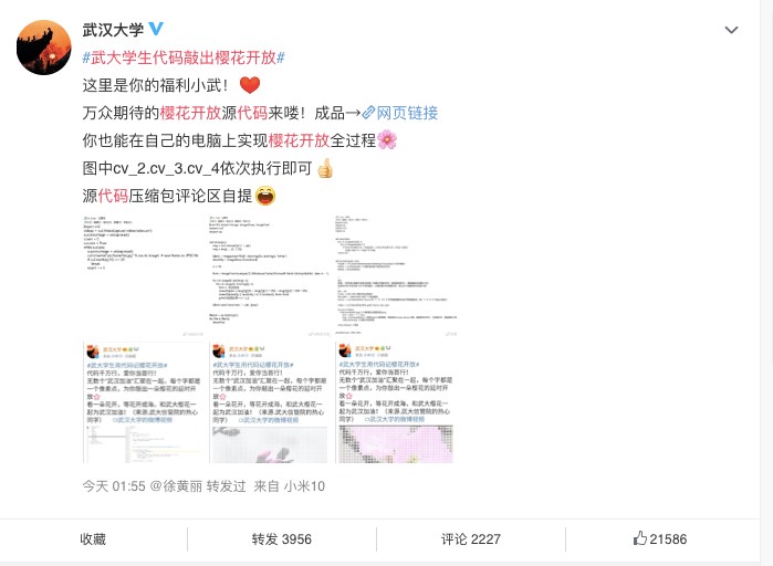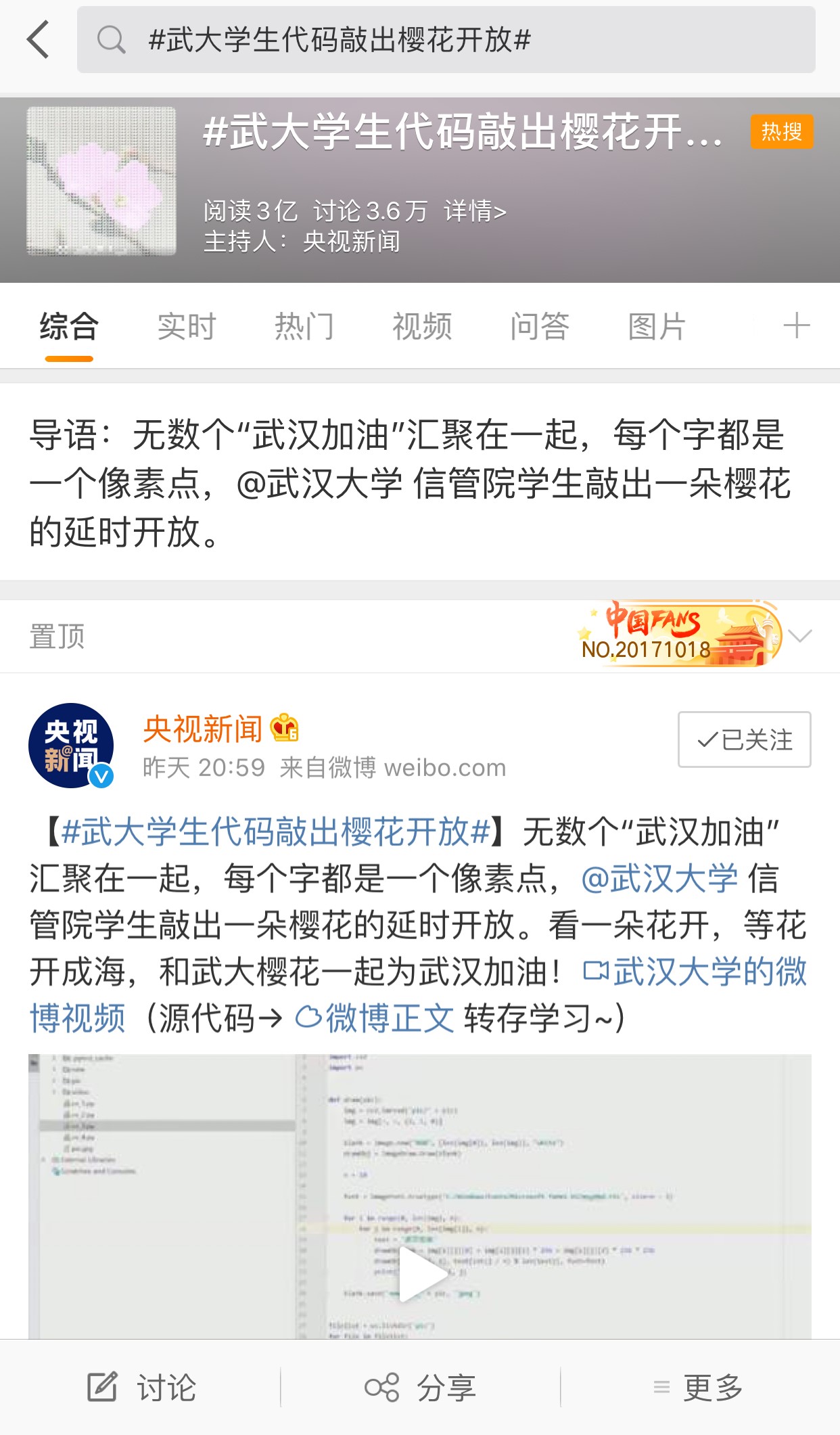 2020年3月,由武汉大学、央视新闻等新浪微博官方账号发布的#武大学生代码敲出樱花开放#话题在新浪微博热搜排名高达第六位,引发广泛关注。经了解,话题中的“武大学生”是我支部对接的信息管理与信息系统专业本科生支部本科生朱永春,他用代码敲出的樱花开放作品系采用Python创作。至3月19日晚,该话题阅读量超过3亿、讨论数3.6万,网友直呼”正能量,太棒了!”。