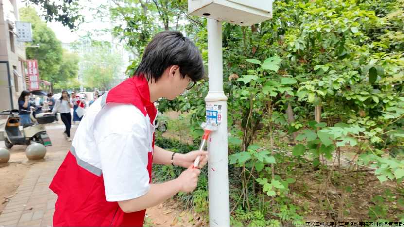 下午两点,同学们前往森林小镇社区,社区工作人员热情接待了大家,并简要介绍了社区环境现状及志愿服务重点区域。随后,给大家分发了统一的志愿者马甲和劳动工具。男同学们手持铲刀,专注地清理墙面和电线杆上的小广告;女同学们则拿着环卫垃圾夹,细致地捡拾绿化带中的纸屑、烟头和塑料瓶。在社区主干道、楼栋单元门口和休闲广场,处处可见志愿者们忙碌的身影。