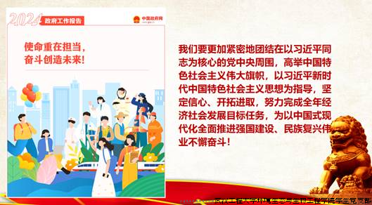 会上,郑冬洁从2023年工作回顾、2024年发展主要预期目标、2024年政府工作任务等方面带领学习了2024政府工作报告,希望同学们志存高远、脚踏实地,把课堂学习和国家发展紧密结合起来,练就过硬本领,为实现中华民族伟大复兴作出应有贡献。同时就学生党建工作提出要求:一是提高政治站位,改进工作作风,各支部要求实效、重实干,树新风、展新貌,以身教作执行的榜样,为全院学生树立改进作风、狠抓落实的典范,发挥“头雁效应”。二是加强支部标准化、规范化建设,落实基层党建工作责任制,严守党员发展纪律、严格坚持发展标准、严肃履行入党手续。三是加强学生党员队伍建设,严把党员发展质量,要加强对入党积极分子的培养,深入推进党员示范岗挂牌、党员示范寝室创建和党员宿舍导师制,充分发挥党员模范带头作用。四是要激发支部活力,打造“一支部一特色”的党建品牌。高标准完成“规定动作”,高质量完成“自选动作”,创新主题党日活动形式,不断丰富活动内容,让主题党日“活”起来。