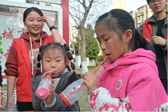 “当我们向瓶口吹气时,瓶内空气柱会产生振动,振动频率不同就会发出高低不同的声音。”活动中,志愿者向孩子们讲解“空气振动发声”的科学原理,并引导孩子们利用废弃塑料瓶、吸管和胶带等材料,动手制作能吹响的“空气号角”。通过调整吸管插入瓶身的深度和角度,孩子们直观感受到空气柱长度与音调变化的关系,将抽象理论转化为可操作的趣味实验。