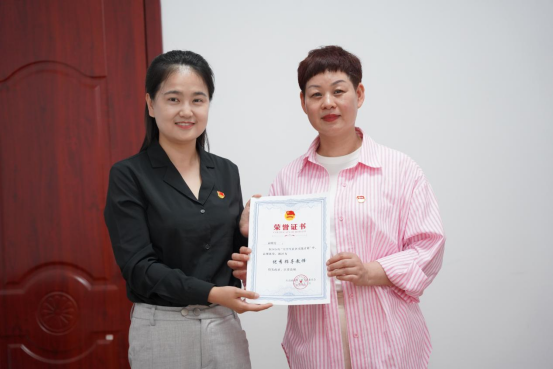 谢姗姗代表学校为袁明芳颁发“大学生社区实践计划”优秀指导老师证书。