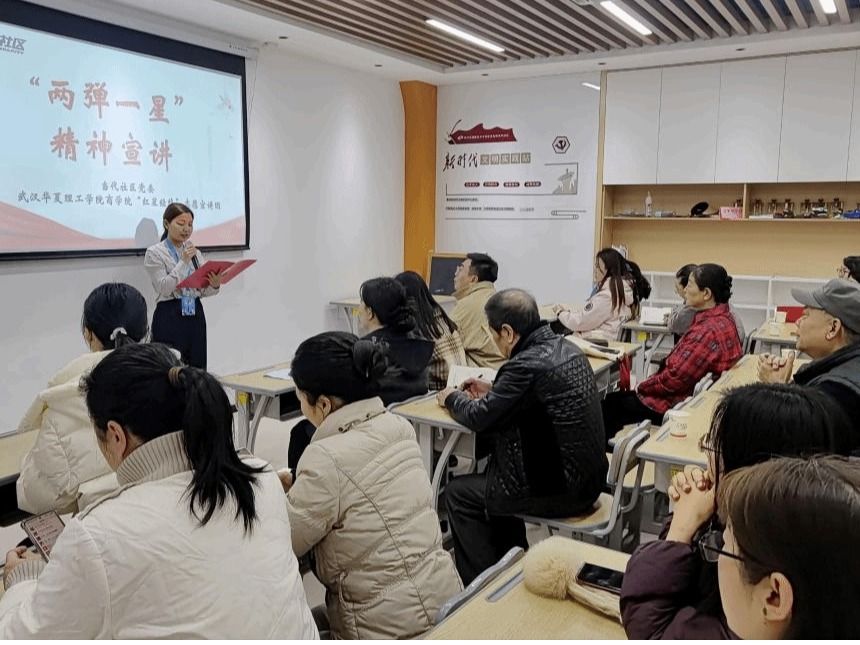 近日,当代社区新时代文明实践站内红歌嘹亮、温情涌动,武汉华夏理工学院商学院第四党支部联合党员服务站“红星经纬”宣讲团应邀参加社区11月党日活动,以沉浸式形式开展“传承‘两弹一星’精神,致敬元勋王淦昌”主题宣讲。当代社区党委书记刘梦洁、副书记李嵘,社区40余名老党员,武汉华夏理工学院商学院党总支组织员杨洋,商学院党员服务站“红星经纬”宣讲团主要成员共同参与活动。