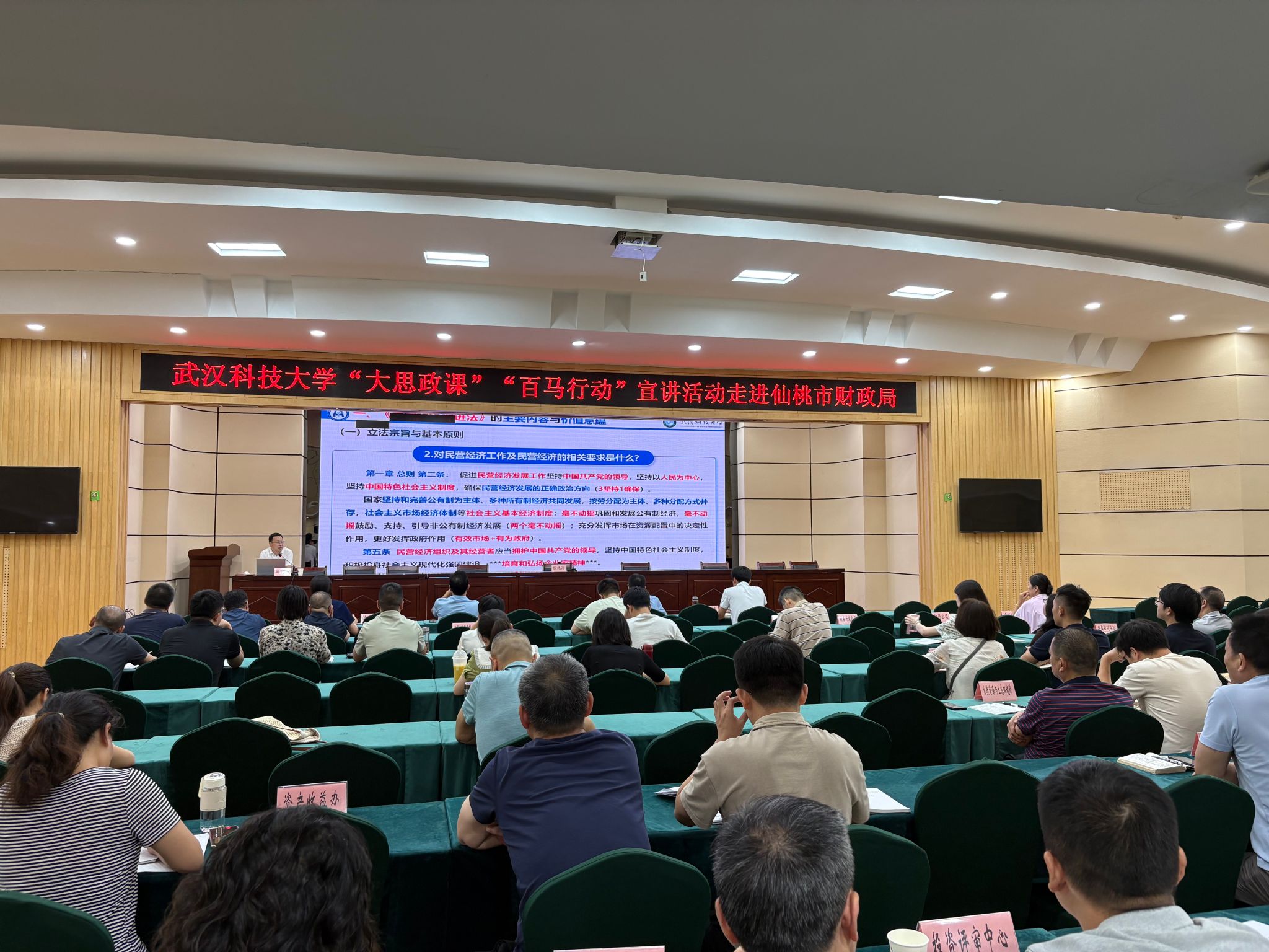 在市财政局,马克思主义学院院长刘文波教授以《行胜于言 法大于权<民营经济促进法>的价值意蕴和精神解读》为题,深入剖析了我国第一部民营经济基础性法律的历史意义与现实价值,深刻阐释了其“从政策松绑到权利法定” 的法治化进程,从“为什么要发展民营经济”“发展什么样的民营经济”“如何发展高质量的民营经济”三个维度系统讲述了习近平总书记关于民营经济发展的重要论述,全面系统解读了《民营经济促进法》的主要内容、立法背景、基本原则、核心议题、工作要求及精神要旨。局党组班子成员、局属单位负责人等100余人认真聆听了报告,大家纷纷表示,要站在服务国家战略和全市发展大局的高度,将支持民营经济发展作为财政工作的重要方向,躬身入局、靠前服务,不断提升运用法治思维和市场化手段服务民营经济的能力。