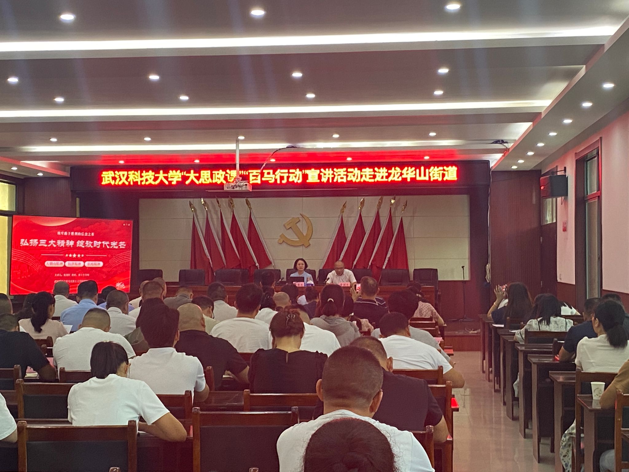 在龙华山街道,马克思主义学院副院长张荆红教授以《弘扬三大精神 绽放时代光芒》为题,从三大精神的主要内容和时代价值、以三大精神充盈支点建设的火热实践和凝聚三大精神投身支点建设等方面,进行系统全面的阐释。结合国际国内形势与湖北省省情,提出领悟三大精神的核心要义,在知往鉴今、抚今望远中拓宽逐梦航道,在长江经济带高质量发展中奋勇争先,加快建成中部地区崛起的重要战略支点,奋力谱写中国式现代化湖北篇章,为实现中华民族伟大复兴而奋斗。与会干群纷纷表示,三大精神是党的宝贵精神财富,湖北省是三大精神的孕育之地,将进一步统一思想和行动,锚定强国建设,凝聚更强劲、更高昂、更饱满的精神能量和实践能量。