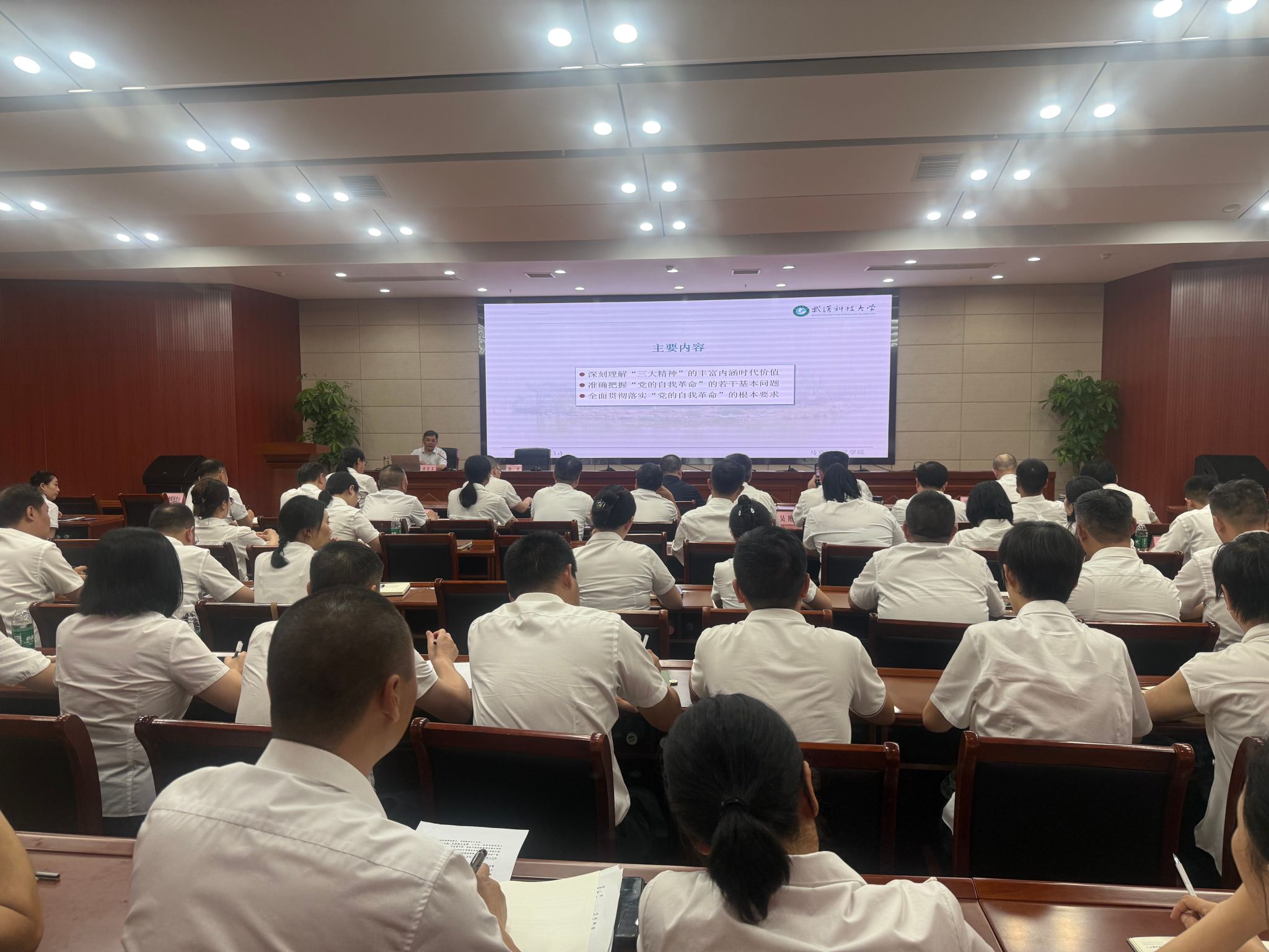 在市卫健委1203会议室,马克思主义学院党委书记唐忠义教授以《弘扬三大精神 推进自我革命》为题,从深刻理解“三大精神”的丰富内涵时代价值、准确把握“党的自我革命”的若干基本问题、全面贯彻落实“党的自我革命”的根本要求三个方面,从理论的深度,用生动的案例深入浅出进行了阐释。市委宣传部全体机关干部、市融媒体中心、市文联、市文旅局等单位机关干部110余人认真聆听了报告。台上讲得生动,台下听得认真。“报告既有理论高度,又紧密联系工作实际,为我们今后的工作进一步指明了方向。”与会人员纷纷表示,要弘扬好三大精神,共同努力推进自我革命,不断强化支点意识、争先意识、效率意识、为民意识、能力意识,努力在建设仙桃的新征程上展现新作为、体现新担当、作出新成绩。