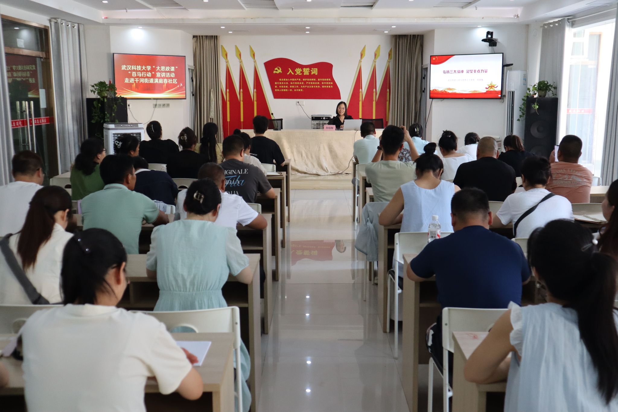 按照省委宣传部、省委讲师团的统一部署,8月27日,武汉科技大学“百马行动”宣讲队一行7人赴仙桃市开展“大思政课”“百马行动”宣讲活动,活动采用专题报告、分众化宣讲、《仙学仙讲》微视频录制等形式,分赴7个市直机关单位、街道、社区等地与党员干部及群众“面对面”交流,深入阐释“三大精神”丰富内涵、深刻解读习近平生态文明思想、坚定唱响中国经济光明论,为仙桃市基层党员干部及群众带来了一场深刻的思想洗礼,推动党的创新理论在基层落地生根。