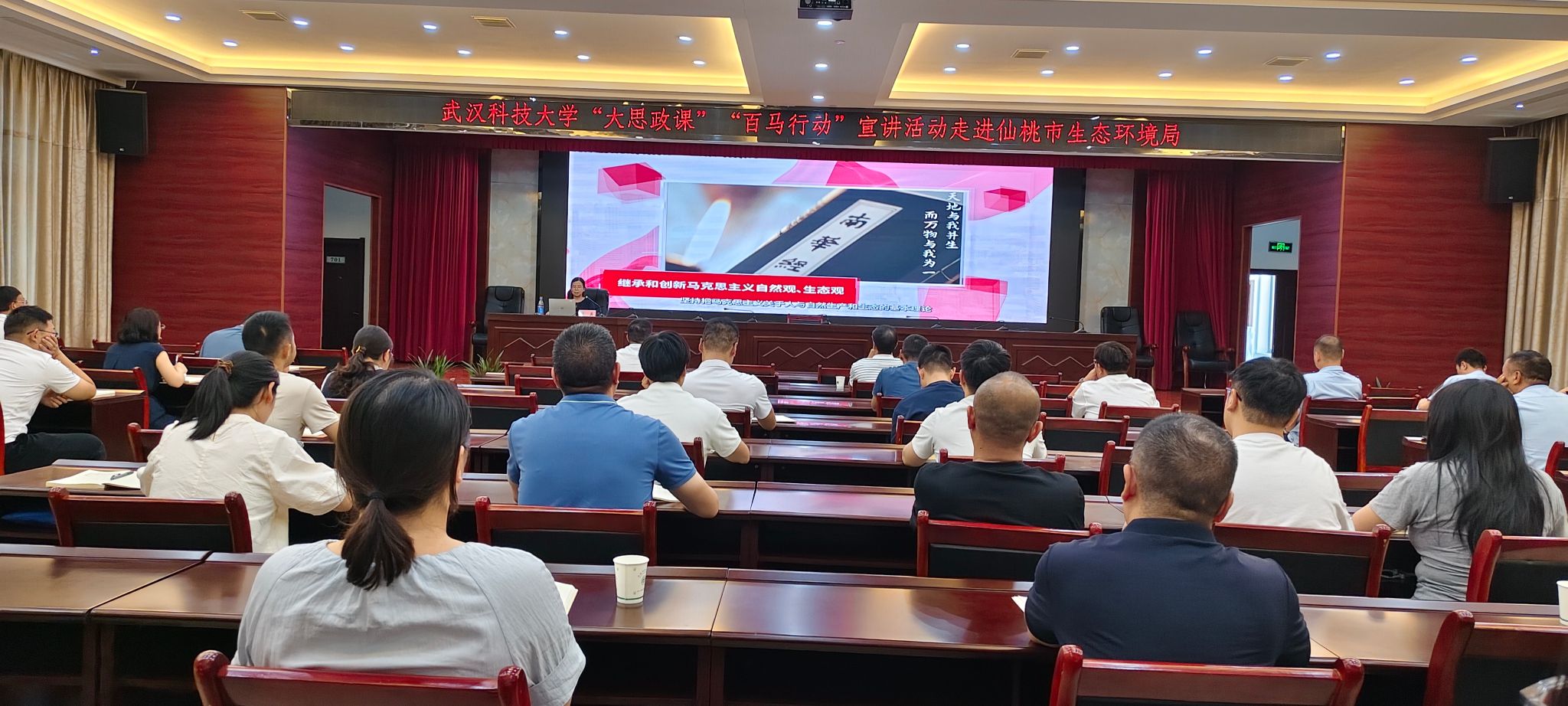 在市生态环境局,马克思主义学院张英教授结合湖北省正在扎实推进的第三轮中央生态环境保护督察反馈问题整改工作,以《习近平生态文明思想核心要义》为题,从深刻认识生态文明建设的重大意义、正确理解社会主义生态文明的丰富内涵、全面把握推进生态文明建设的实践要求等方面,阐释了习近平生态文明思想的科学体系和精髓要义。习近平生态文明思想是习近平新时代中国特色社会主义思想的重要组成部分,是新时代我国生态文明建设的根本遵循和行动指南。与会干群纷纷表示,要坚持用习近平生态文明思想武装头脑、指导实践,直面问题与挑战,强化生态环境建设和治理,奋力谱写中国式现代化和美丽中国的湖北华章。