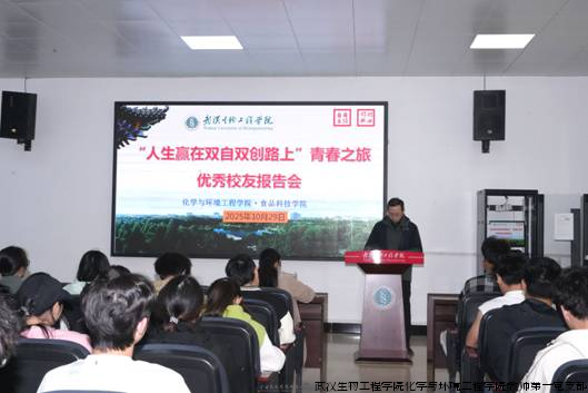 为充分发挥优秀校友榜样示范作用,激发学生专业学习兴趣,更好规划未来发展方向,2025年10月29日下午,化学与环境工程学院・食品科技学院在南1102学术报告厅举办“人生赢在双自双创路上”青春之旅优秀校友事迹报告会,特别邀请学院环境工程专业2020届毕业生、目前在华中科技大学博士在读的优秀校友刘菁非返校做专题分享,校友办副主任宋娟、学院2025级、2024级应用化学、环境工程专业学生参会,学院党总支副书记李本全主持会议。
