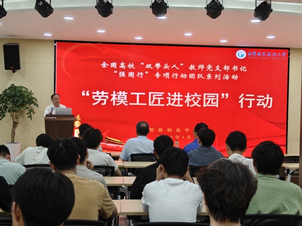 5月22日,武汉职业技术大学智能制造学院迎来一场别开生面的匠心传承课。作为全国高校党建工作样板支部培育单位,智能制造学院教师第一党支部精心策划的全国高校“双带头人”教师党支部书记“强国行”专项行动系列活动之"劳模工匠进校园"主题活动如期举行。