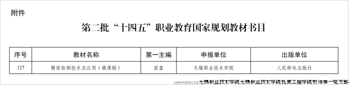 1月26日,教育部职业教育与成人教育司公布了第二批“十四五”职业教育国家规划教材书目,共确定2957本教材为第二批“十四五”职业教育国家规划教材。党支部书记苗盈主编的《精密检测技术及应用(微课版)》成功入选,这是无锡职业技术大学机械工程学院教师第一党支部继《数控加工程序编制及操作(第3版)》等5部教材之后,在国家级规划教材建设领域再添硕果。