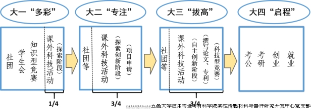 大一,鼓励同学们多多尝试,体验多彩的大学生活。此时最重要的是鼓励同学们勇于思考、提出自己的想法、积极探索。大二,鼓励同学们梳理自己的创新思路,撰写实验方案,申请大学生创新创业项目,开展系统性的科学实验。大三,引导同学们积极总结、提炼自己的创新点,撰写相关专利、科学论文、参加“挑战杯”、“互联网+”等科技比赛,课外科技活动进入总结、凝练阶段。