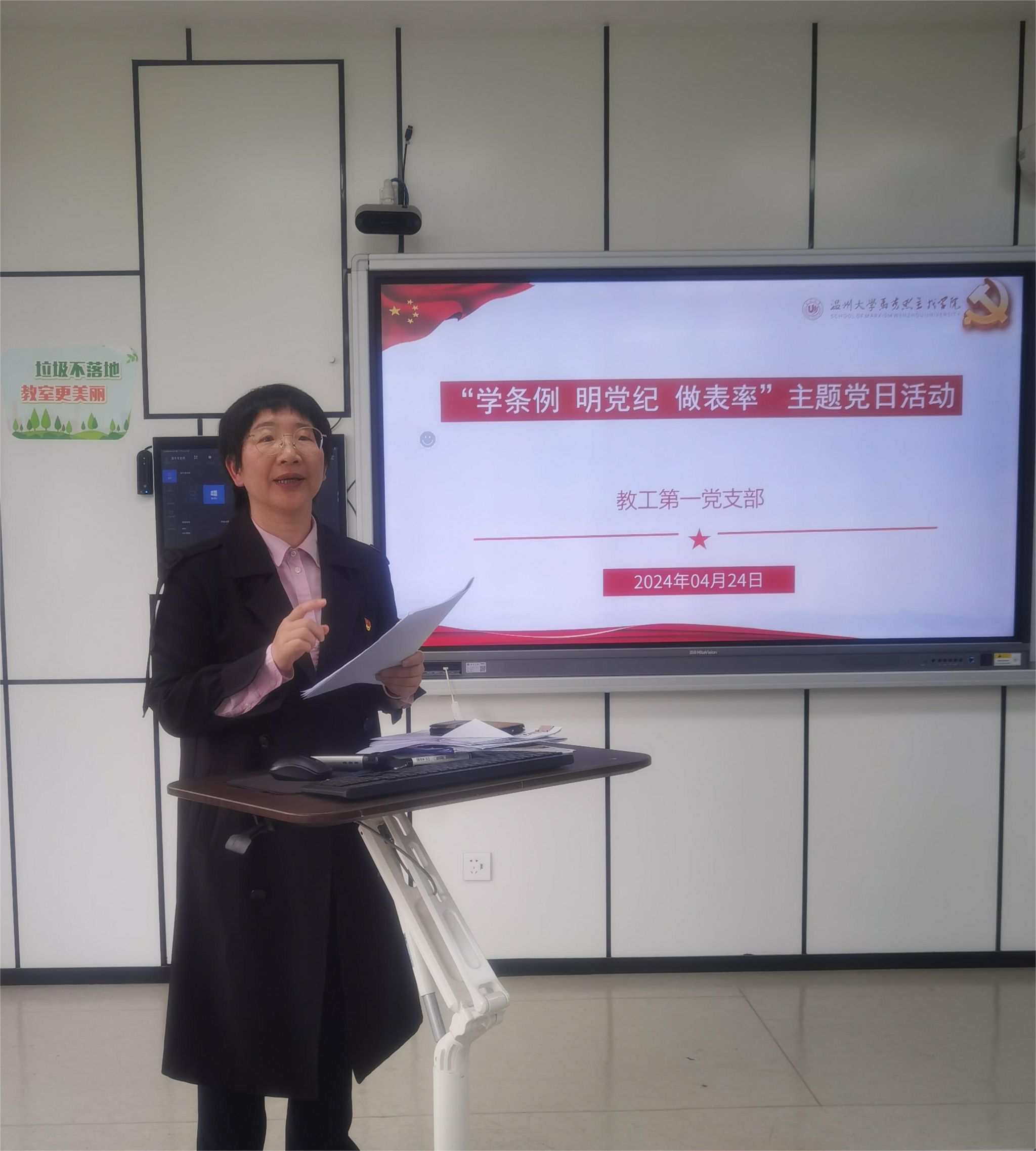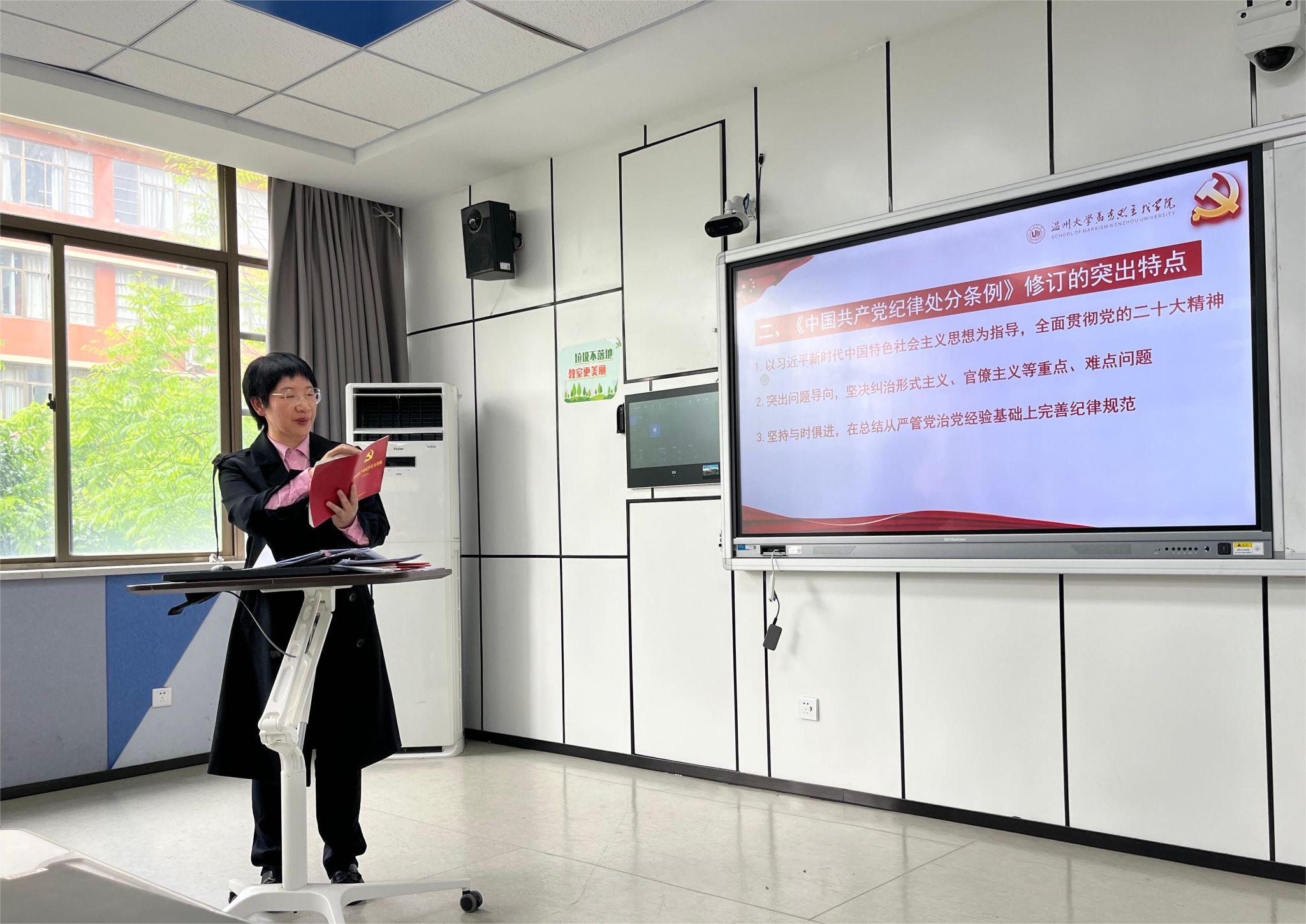 为深入学习贯彻《中国共产党纪律处分条例》(以下简称《条例》),根据学校党委工作要求,4月24日下午,马克思主义学院教工第一党支部全体党员在北校区4-204教室开展了“学条例 明党纪 做表率”主题党日活动,由支部书记项淳芳主持。