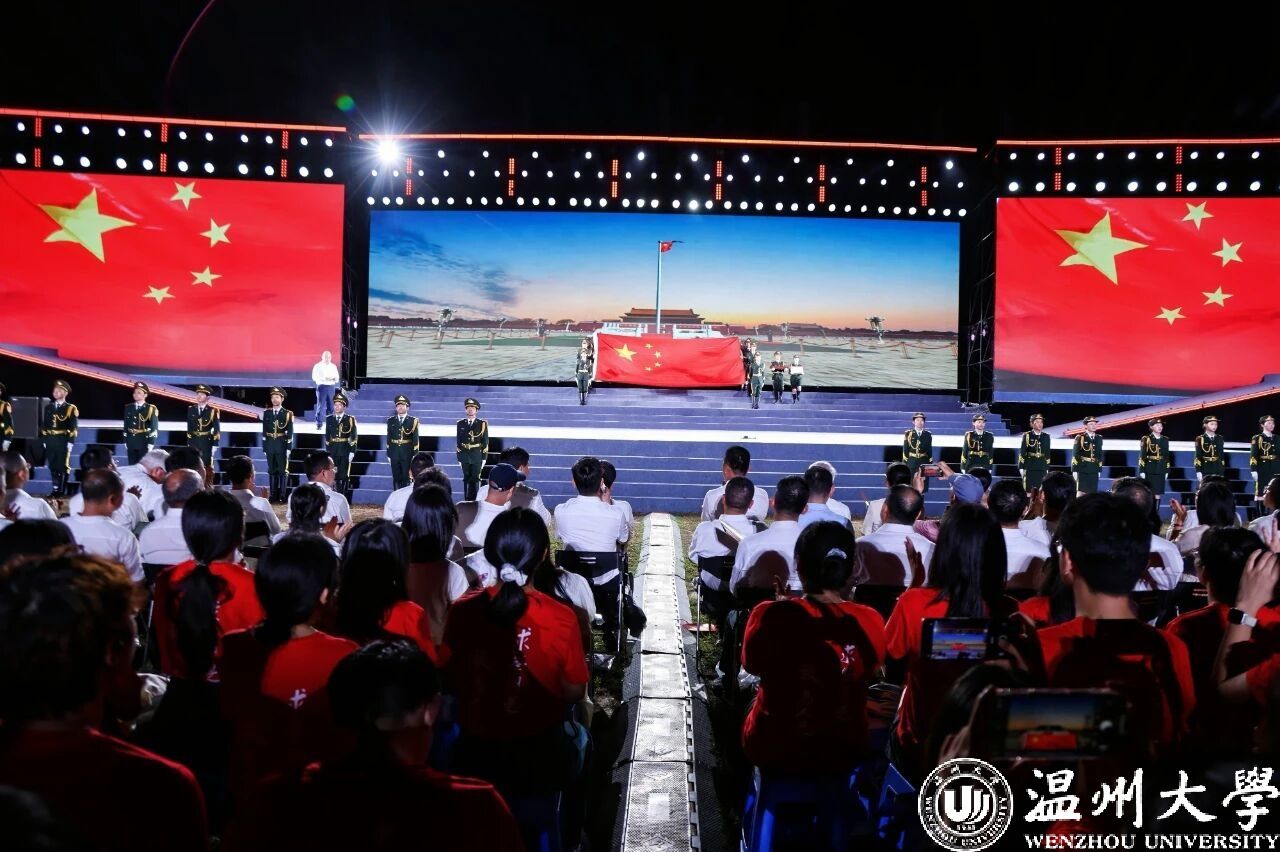 民族气概、信仰之光、忠诚誓言在艺术思政大课现场交织回响,一面于2023年5月19日温州大学办学90周年校庆日,在天安门广场升起的国旗,在“国旗护卫队”的护卫下,庄严入场。全体师生肃立行注目礼,向国旗致敬。爱国情怀与崇高信仰以无比具体、可触可感的方式,深深烙印在每个人的心中。化学与材料工程学院的封浩阳负责本次的展旗任务,“这是我第7次参与升降国旗,却是第1次在艺术思政大课上展旗,心情比以往更激动!”当得知护卫的是来自天安门广场的国旗时,他表示,第一反应是不敢相信,然后是兴奋,最后是敬畏。“我只有一个念头,把每一步走稳,让这面国旗保持最庄严的模样。”