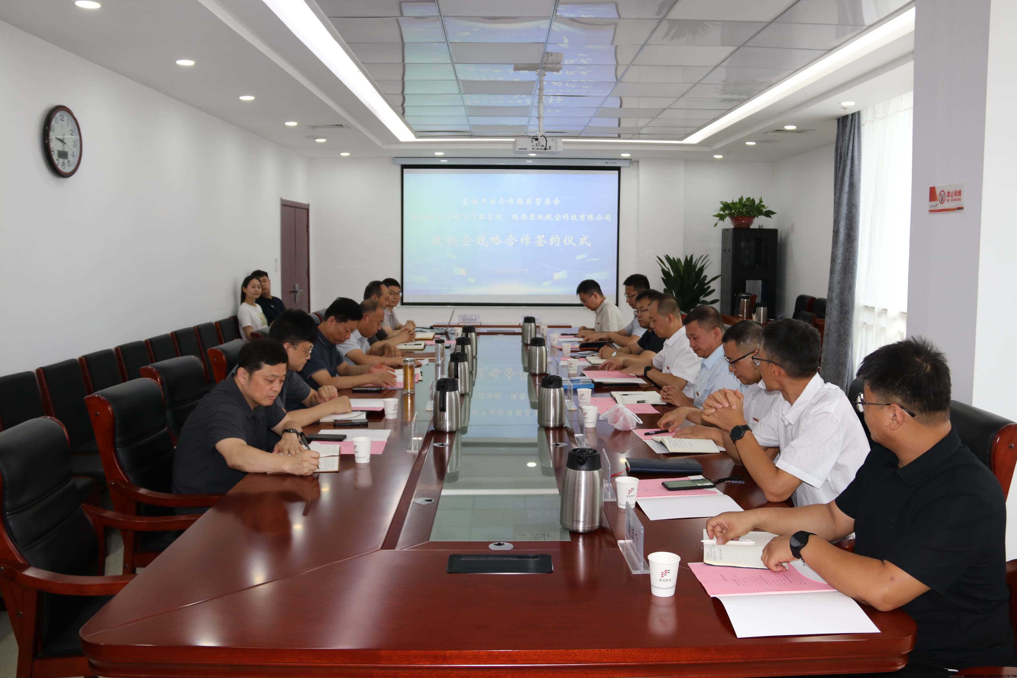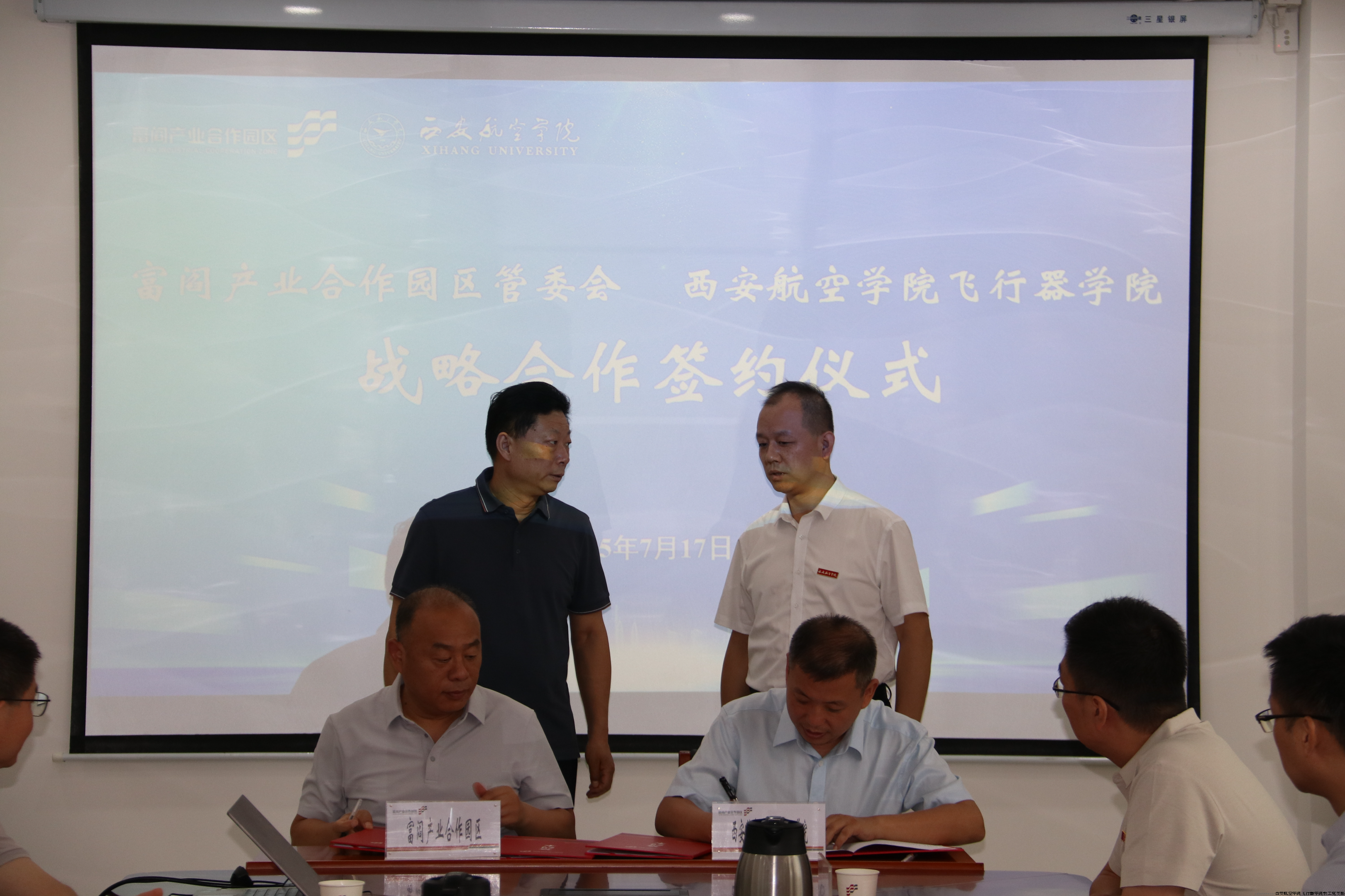 2025年7月17日飞行器学院教工党支部主要成员一行赴富阎产业合作园区交流座谈并举行合作签约仪式。合作签约仪式由管委会副主任张景龙主持,管委会主任杜银虎和飞行器学院教工党支部刘建强分别致辞。签约仪式上,西安航空学院飞行器学院分别与富阎产业合作园区管委会、陕西星轨航空科技有限公司签署战略合作协议。