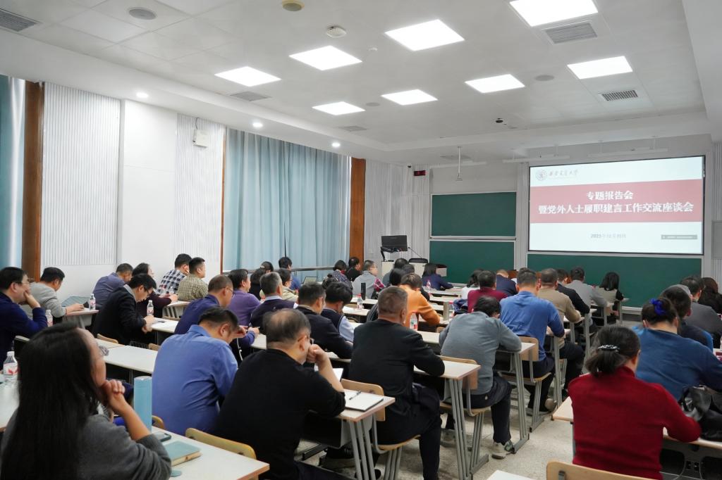 报告会后,与会人员围绕履职建言交流座谈。校党委常委、宣传部部长、统战部部长成进出席会议并讲话。党委统战部副部长邢旭宁主持座谈会。
